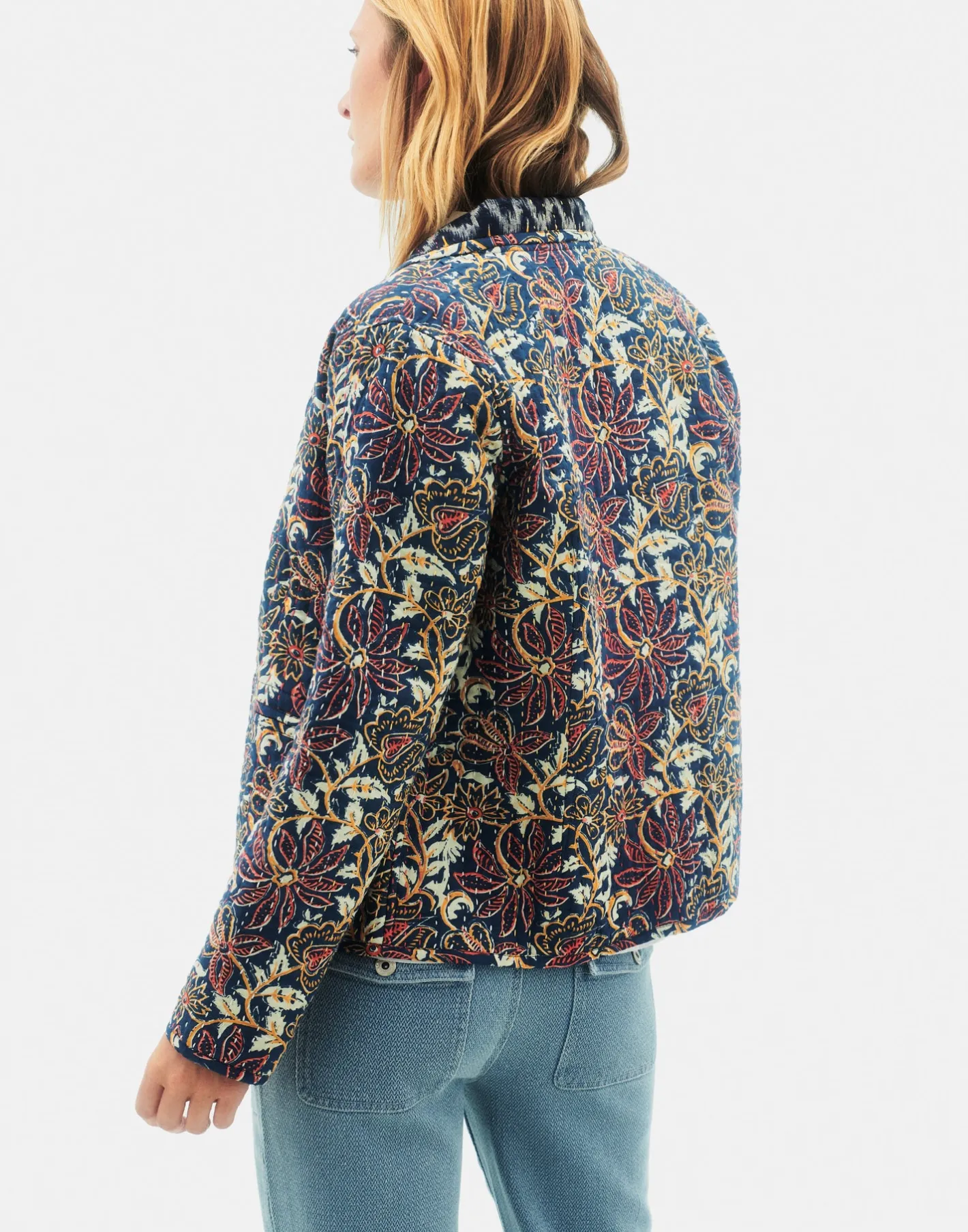 Americana reversible de algodón con estampados y bordados de diseños diferentes. Cuello solapa, sin cierre.
