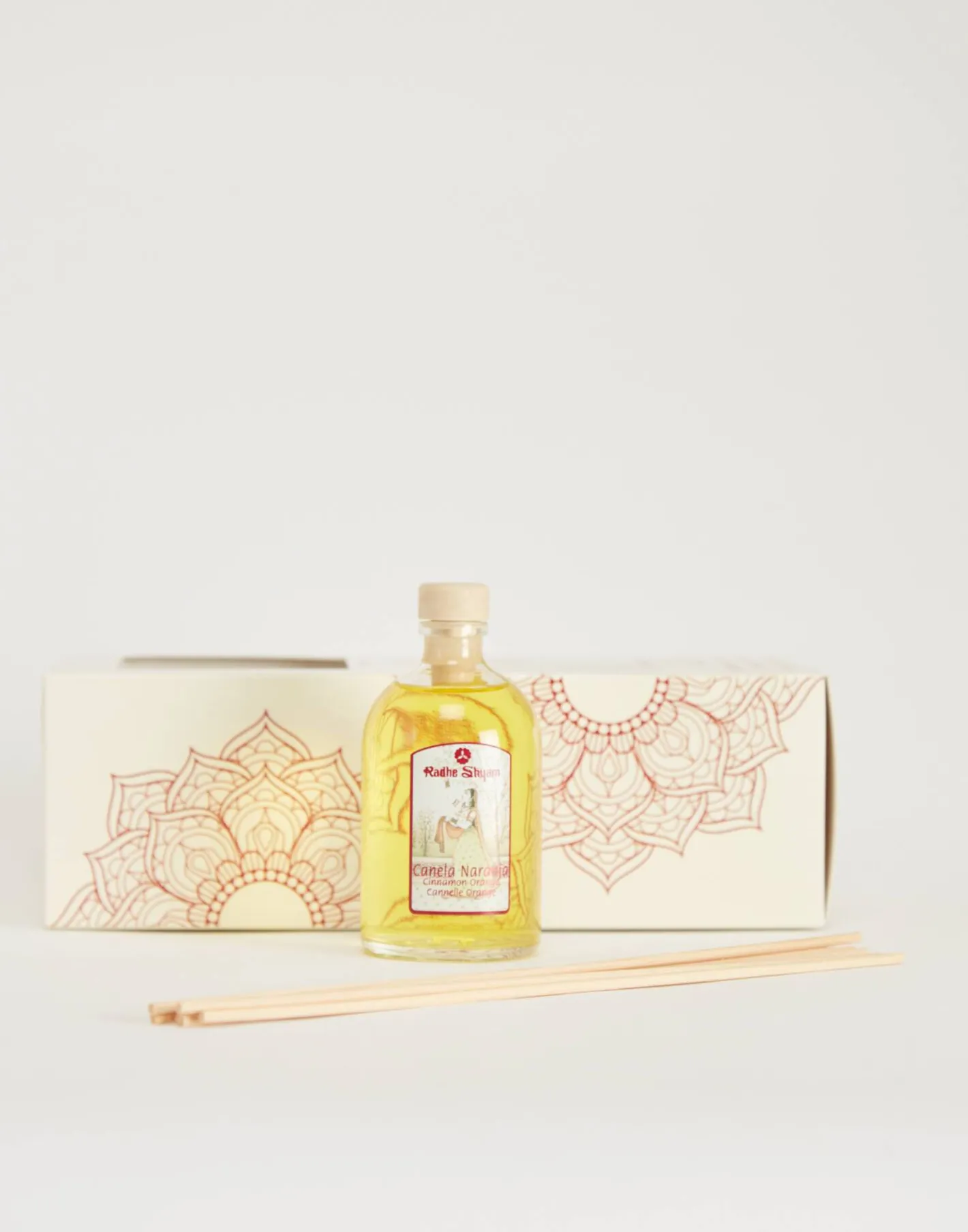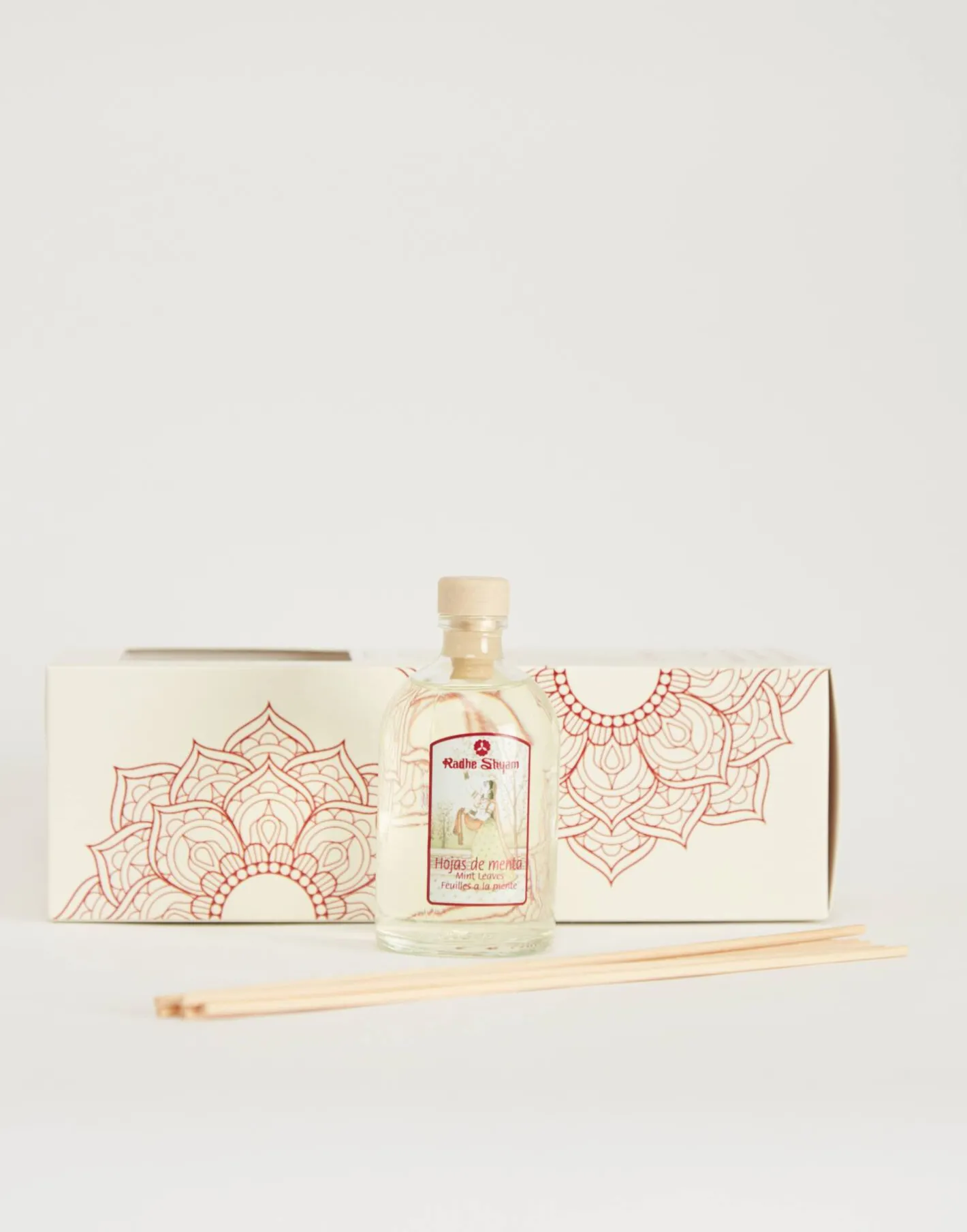 Ambientador mikado Radhe Shyam hecho con esencias de primera calidad. En envase de cristal con varillas de ratán.