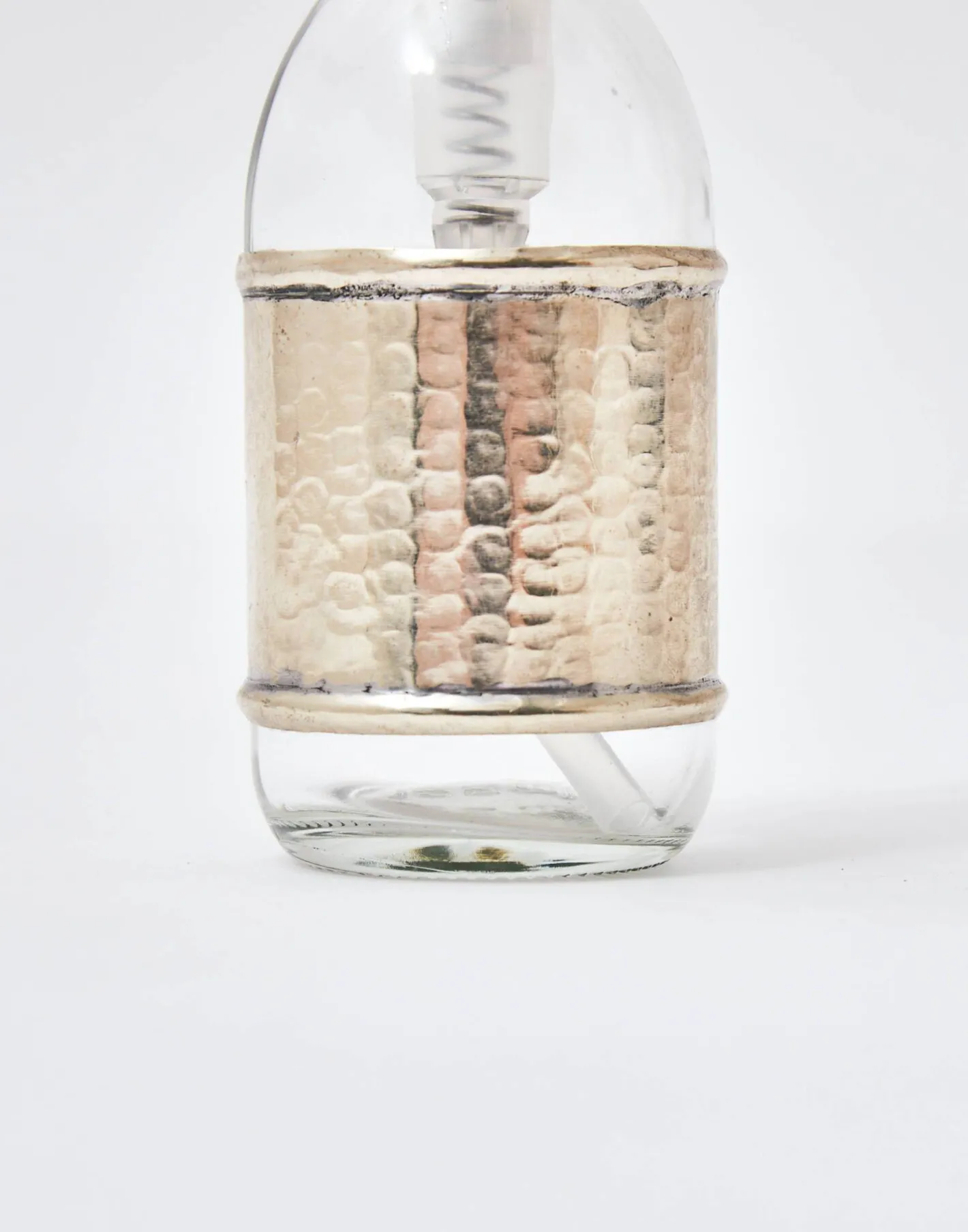 Dosificador de jabón de base redonda realizado en vidrio y latón.
