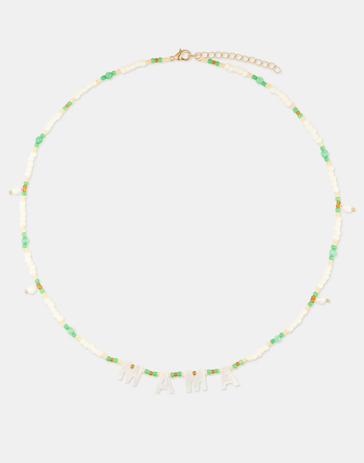 Collar de cuentas de colores, perlas y letras de la palabra mamá. Cierre de cadena ajustable con mosquetón.