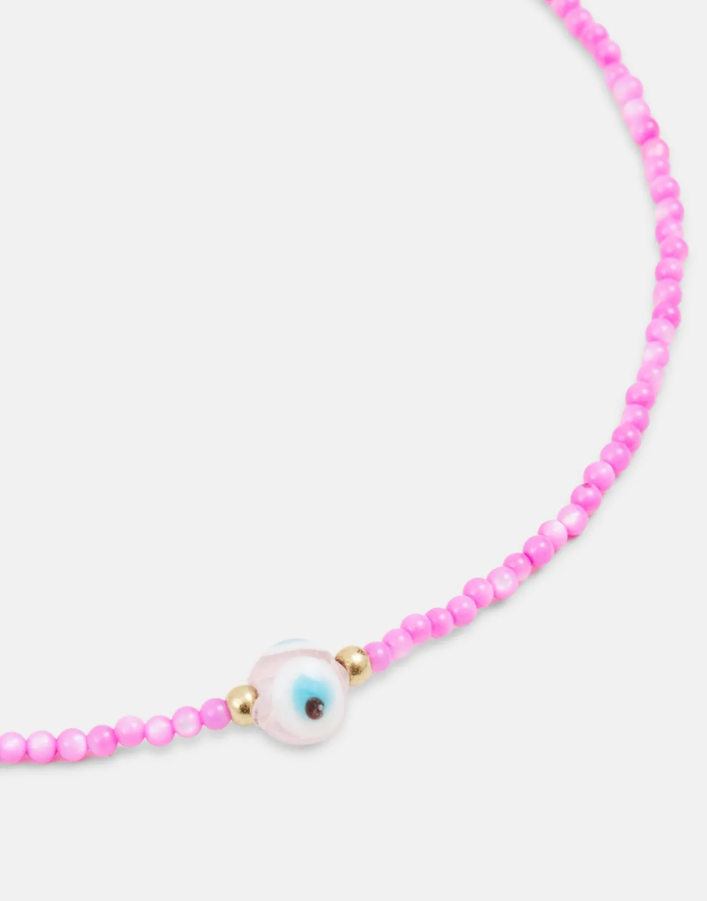 Collar de cuentas con abalorio de ojo turco. Cierre de cadena ajustable con mosquetón.