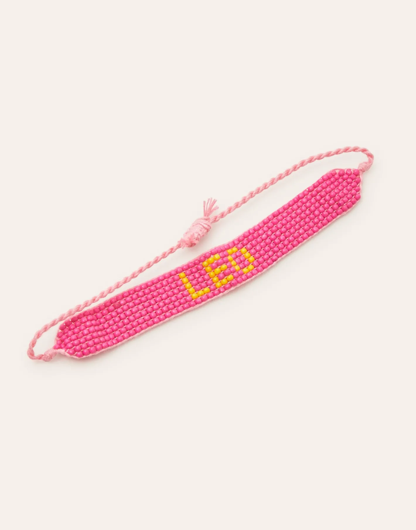 Pulsera ancha con cuentas de vidrio a color formando el nombre de cada signo del zodiaco. Cierre de nudo corredizo.