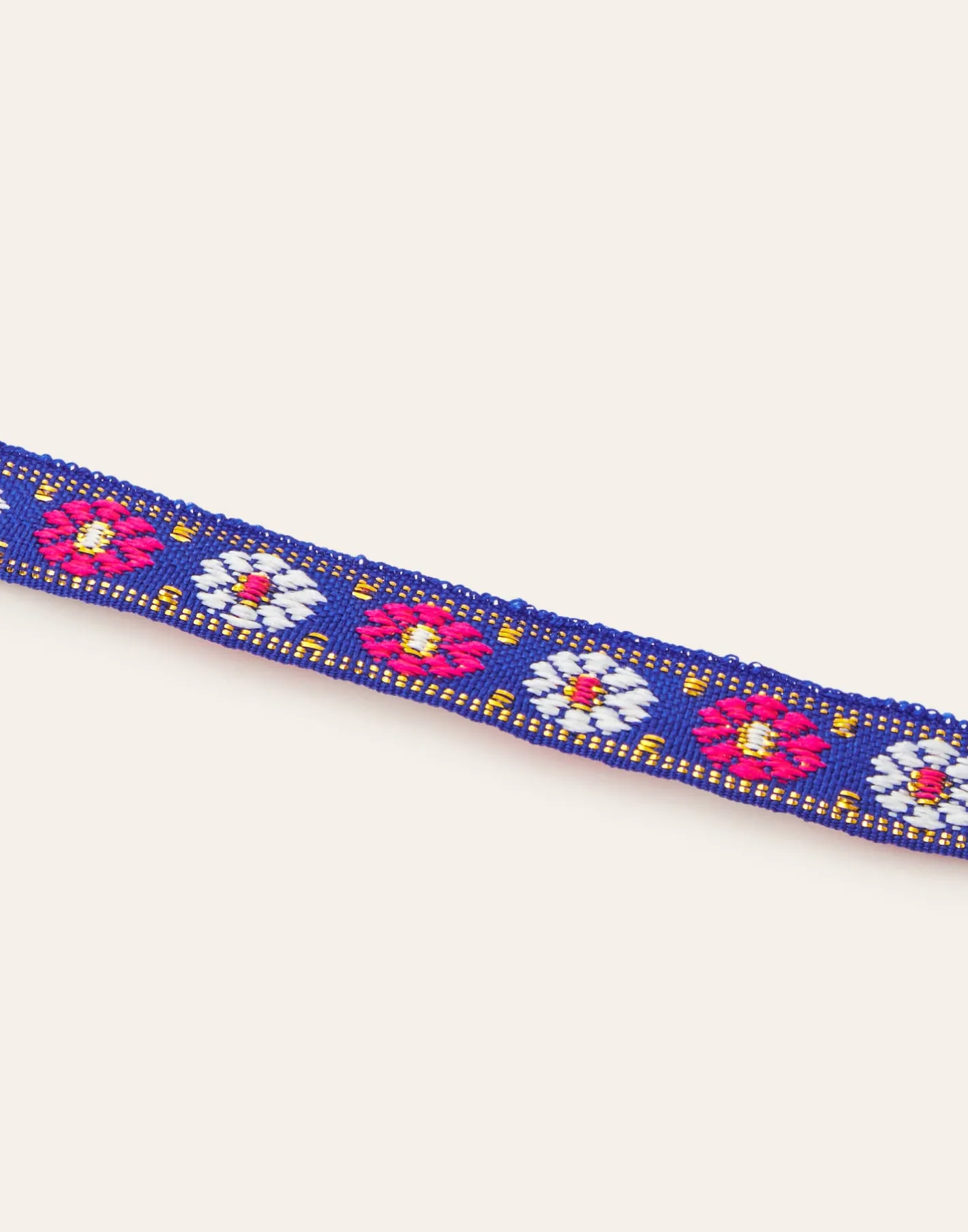 Pulsera de tela bordada con cierre de cadena y mosquetón.