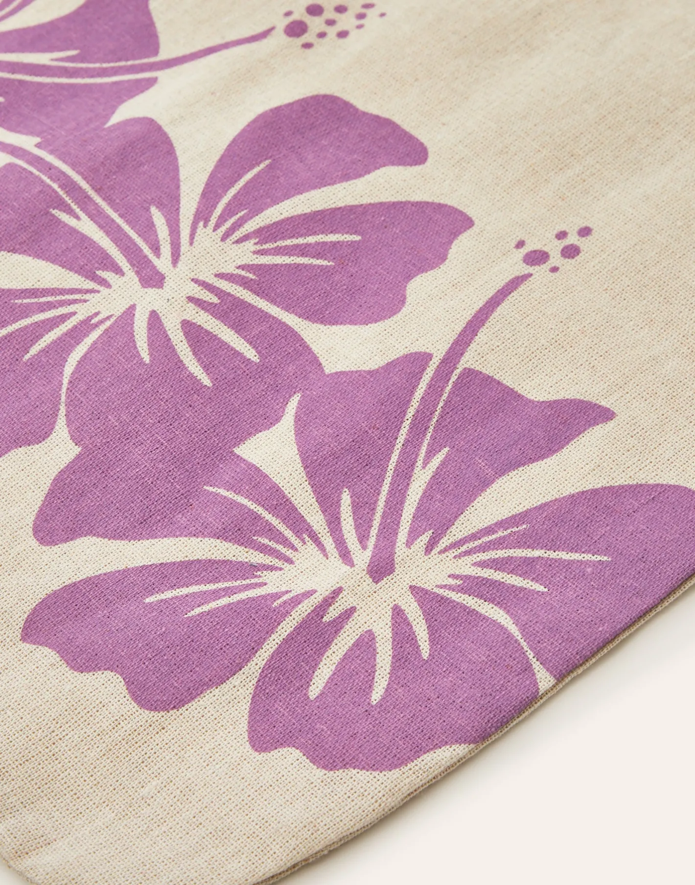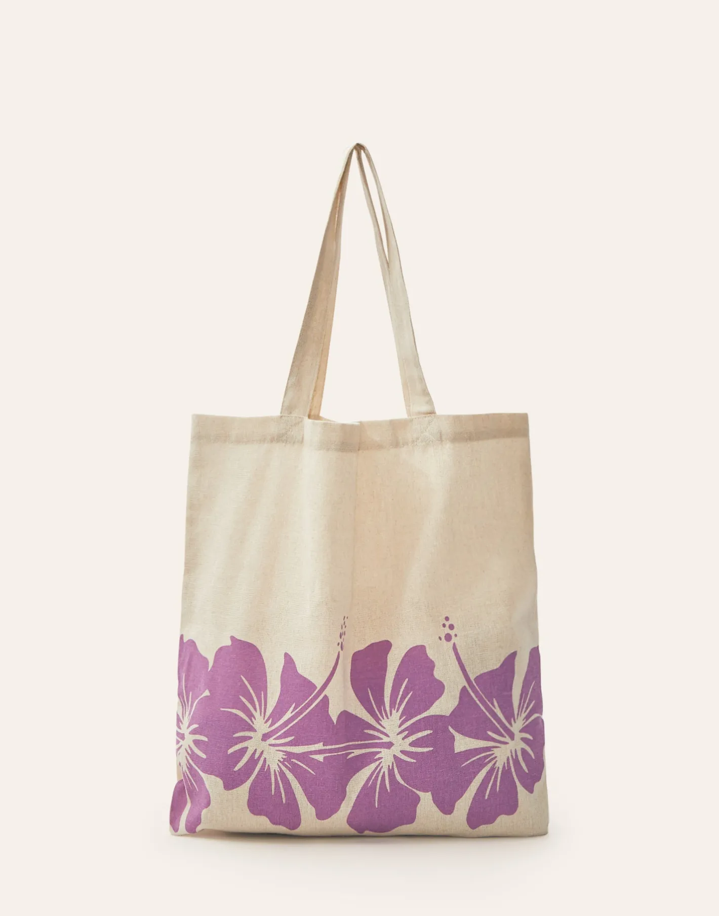 Bolsa de lino tipo tote bag, con dos asas para llevar al hombro y apertura amplia sin cierre. Detalle de palmera en la parte frontal.