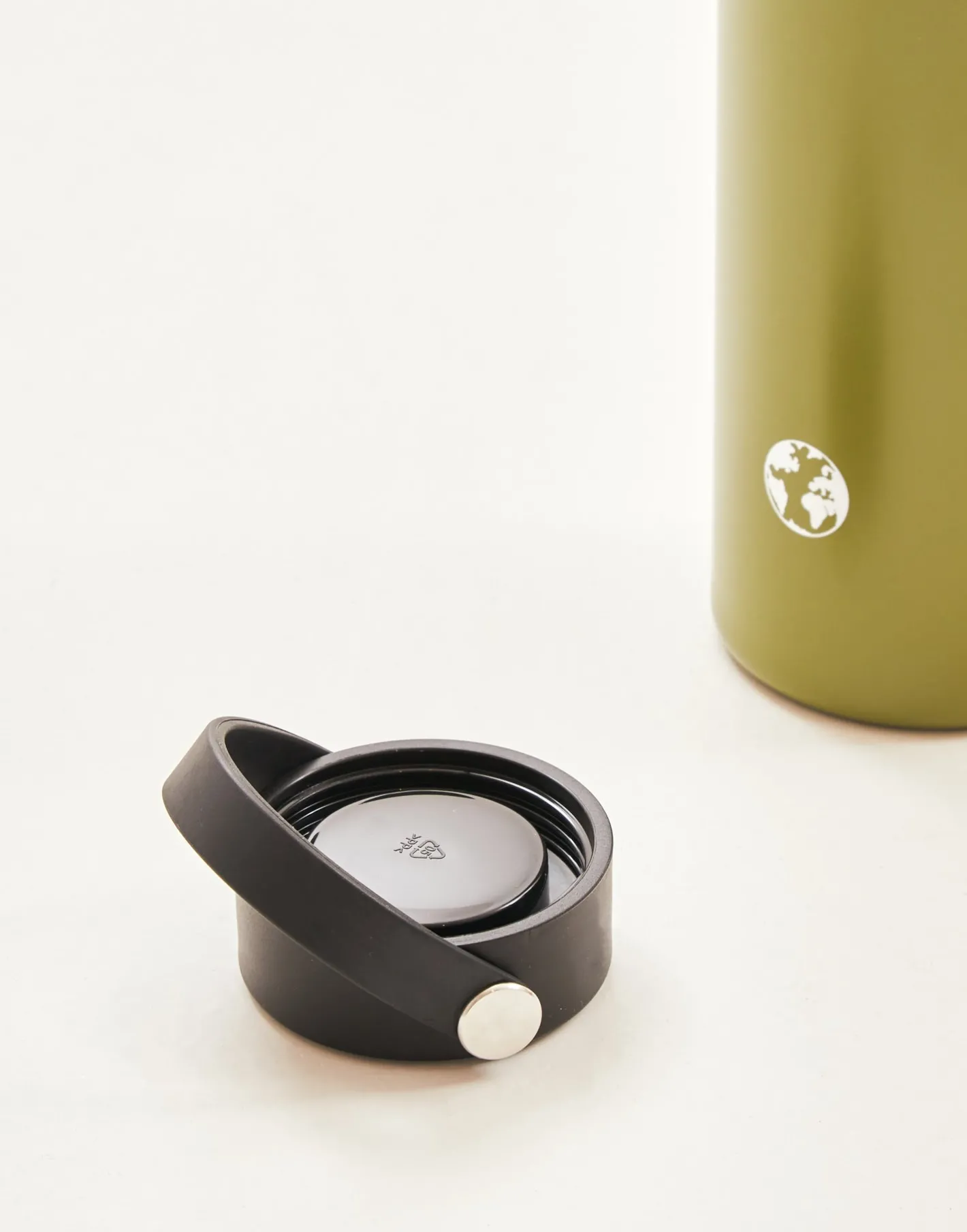 Botella reutilizable de acero inoxidable que puede utilizarse como termo. Acabada en tapón con asa.