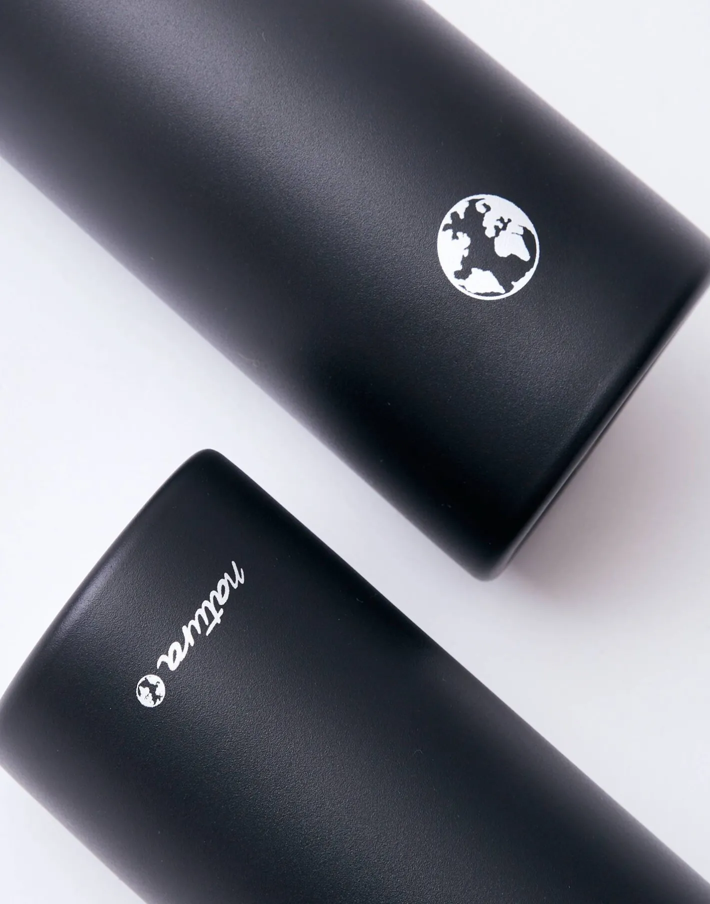Botella reutilizable de acero inoxidable que puede utilizarse como termo. Acabada en tapón con asa.