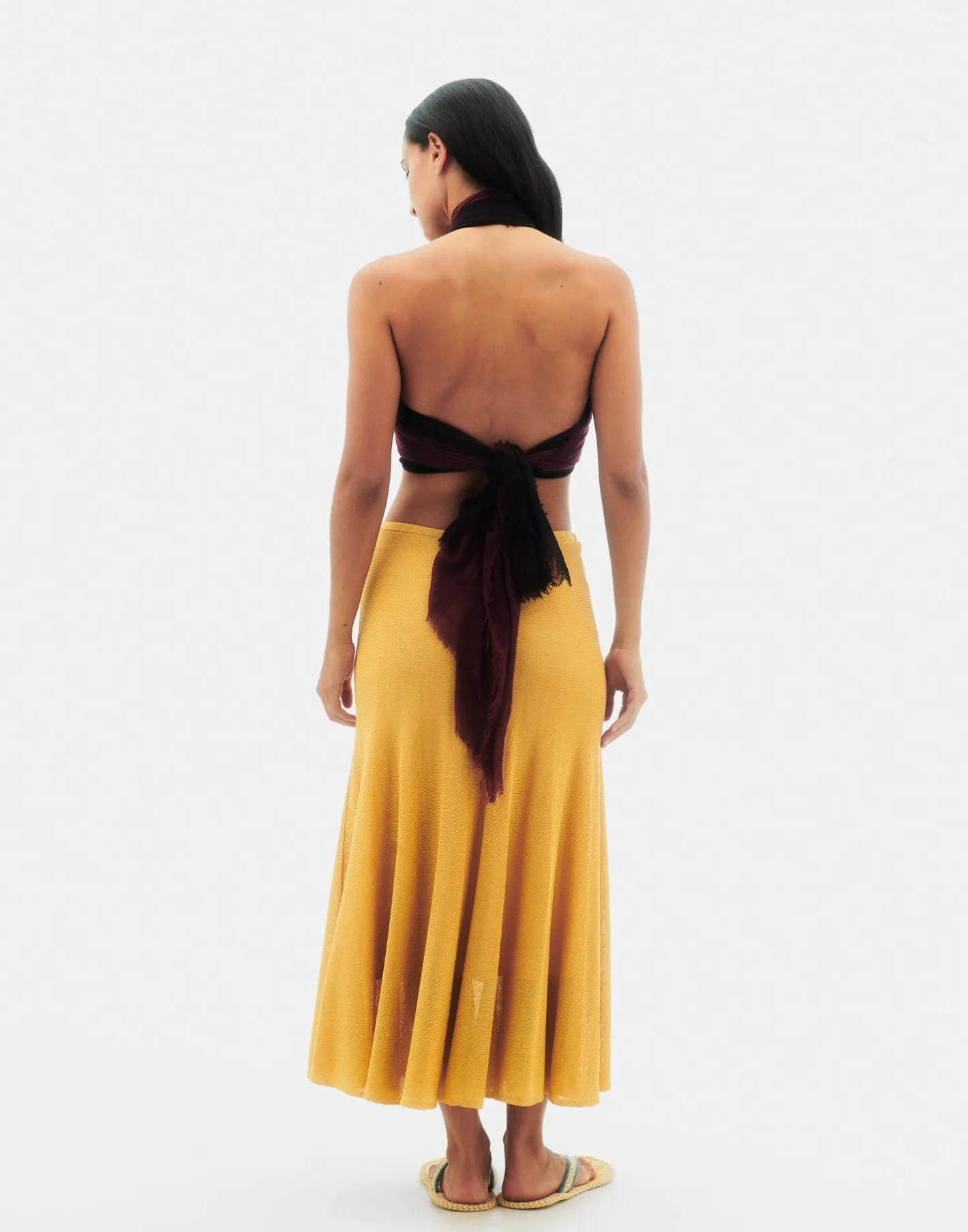 Falda midi de punto con cintura elástica y bajo acabado en volantes.