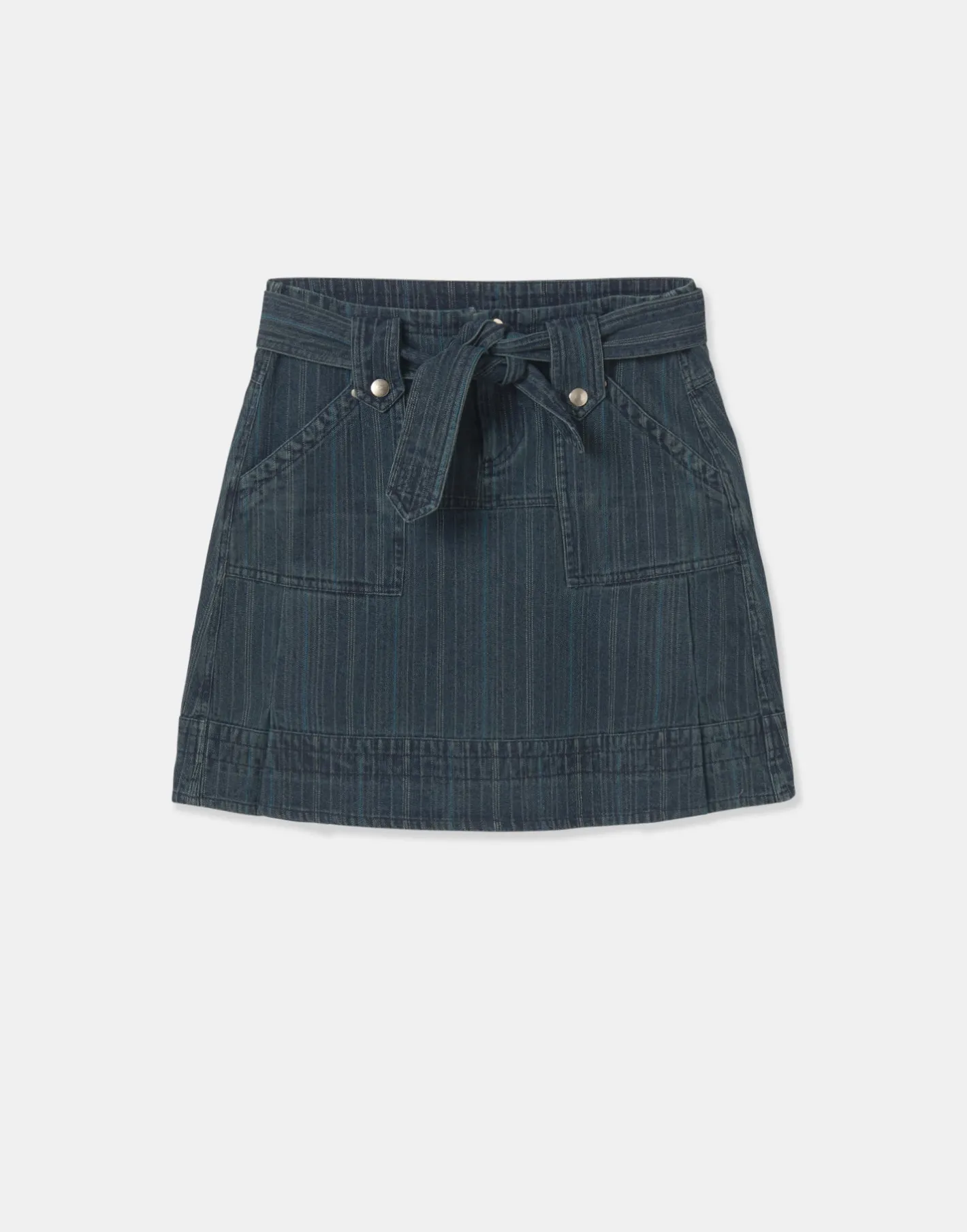 Falda mini tejana con bolsillos laterales y cierre frontal con cremallera oculta y botón metálico. Acabada con trabillas y cinturón tipo lazo a tono.