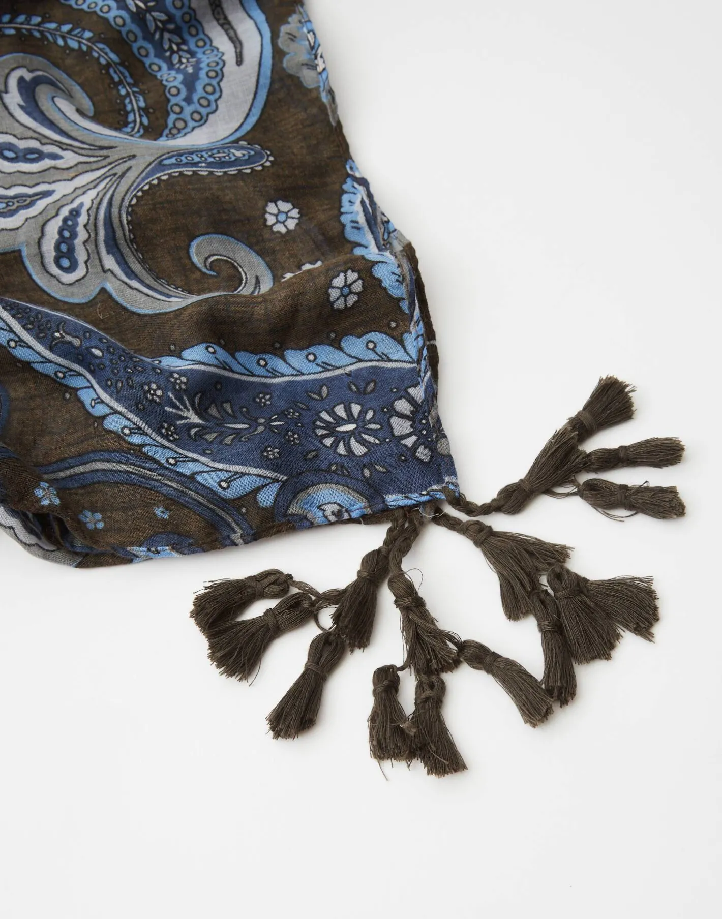 Pañuelo con estampado paisley y detalle de pompones.