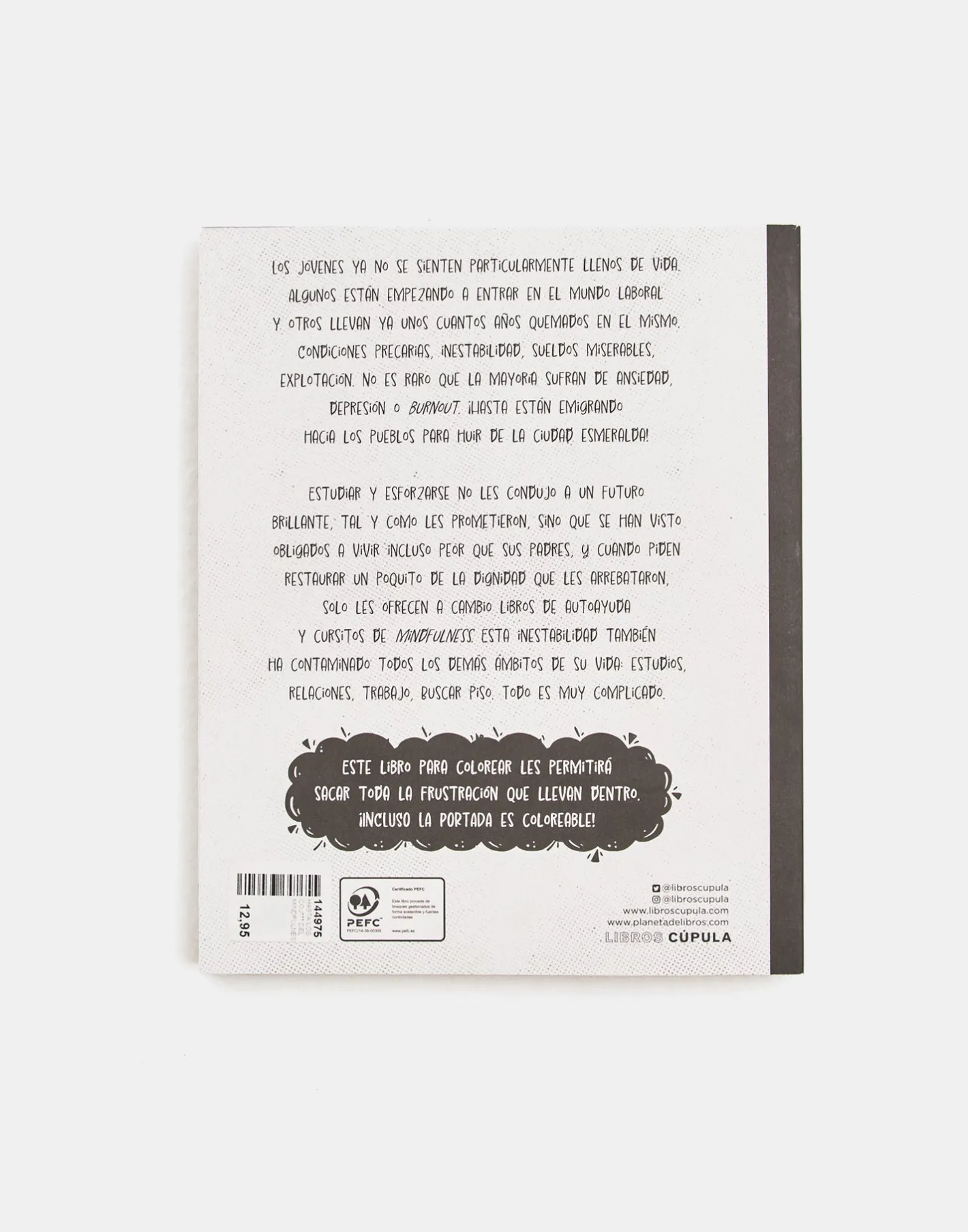 Los jóvenes ya no se sienten particularmente llenos de vida. Algunos están empezando a entrar en el mundo laboral y otros llevan ya unos cuantos años quemados en el mismo. Condiciones precarias, inestabilidad, sueldos miserables, explotación… No es raro que la mayoría sufran de ansiedad, depresión o burnout. ¡Hasta están emigrando hacia los pueblos para huir de la ciudad esmeralda! Estudiar y esforzarse no les condujo a un futuro brillante como les prometieron, sino que se han visto obligados a vivir incluso peor que sus padres. Y cuando piden restaurar un poquito de la dignidad que les arrebataron, solo les ofrecen a cambio libros de autoayuda y cursitos de mindfulness. Esta inestabilidad también ha contaminado todos los demás ámbitos de su vida: estudios, relaciones, trabajo, buscar piso… Todo es muy complicado. Este libro para colorear les permitirá sacar toda la frustración que llevan dentro. ¡A pintar!
