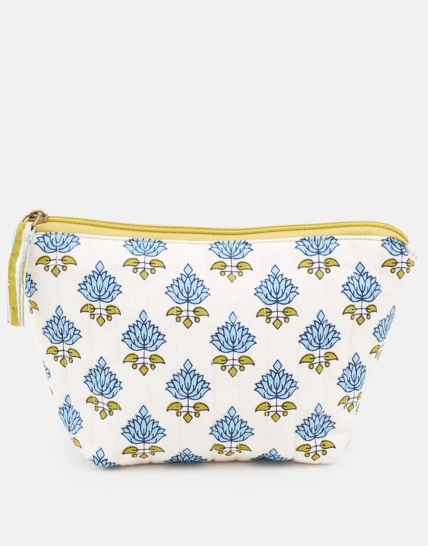 Neceser con estampado floral, forro plastificado y cierre de cremallera.