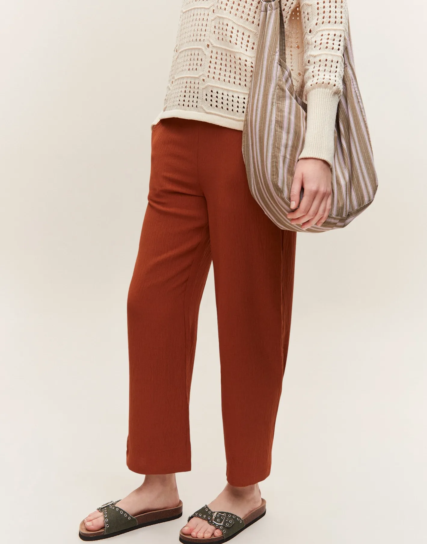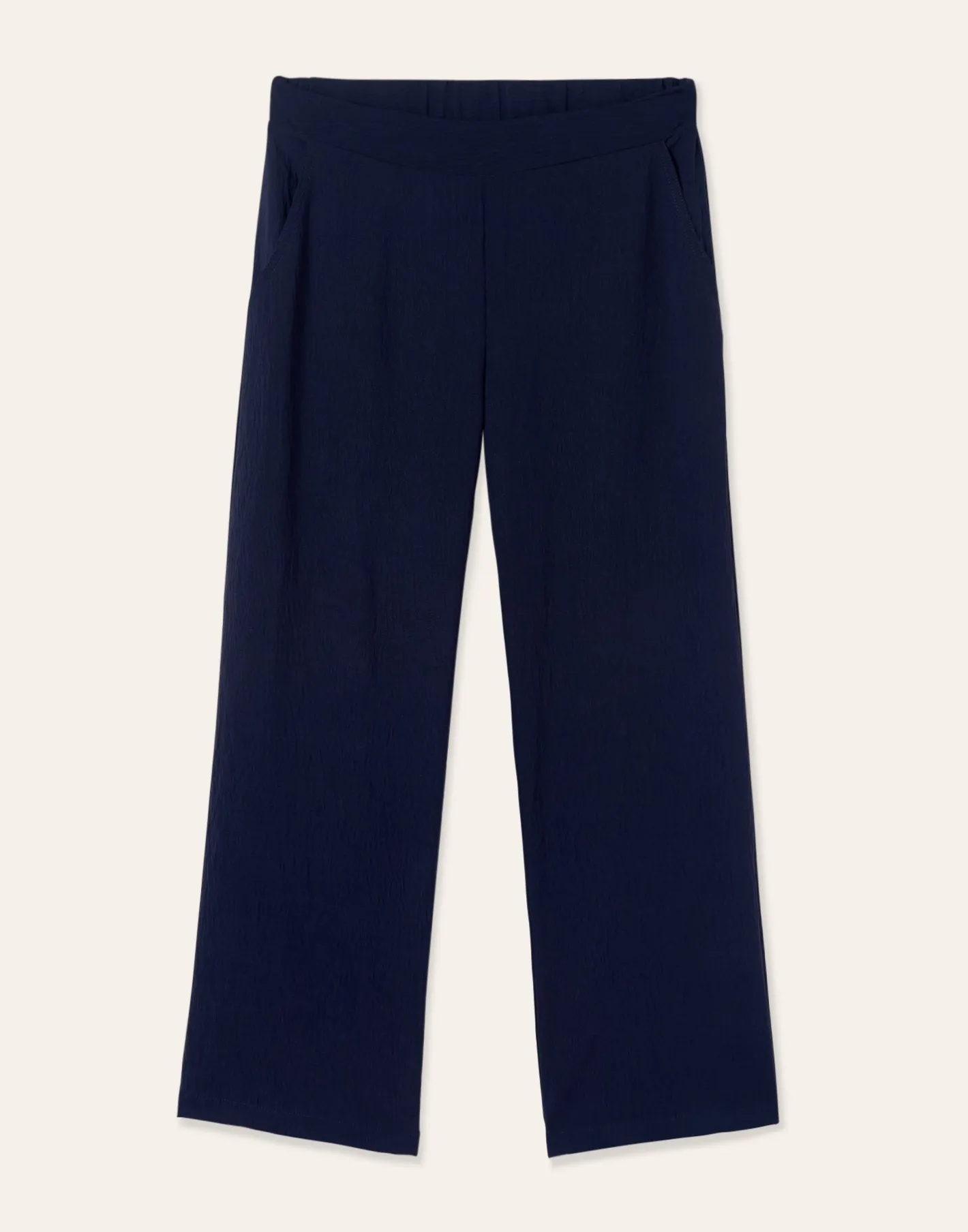 Pantalón recto con cintura elástica y bolsillos laterales.