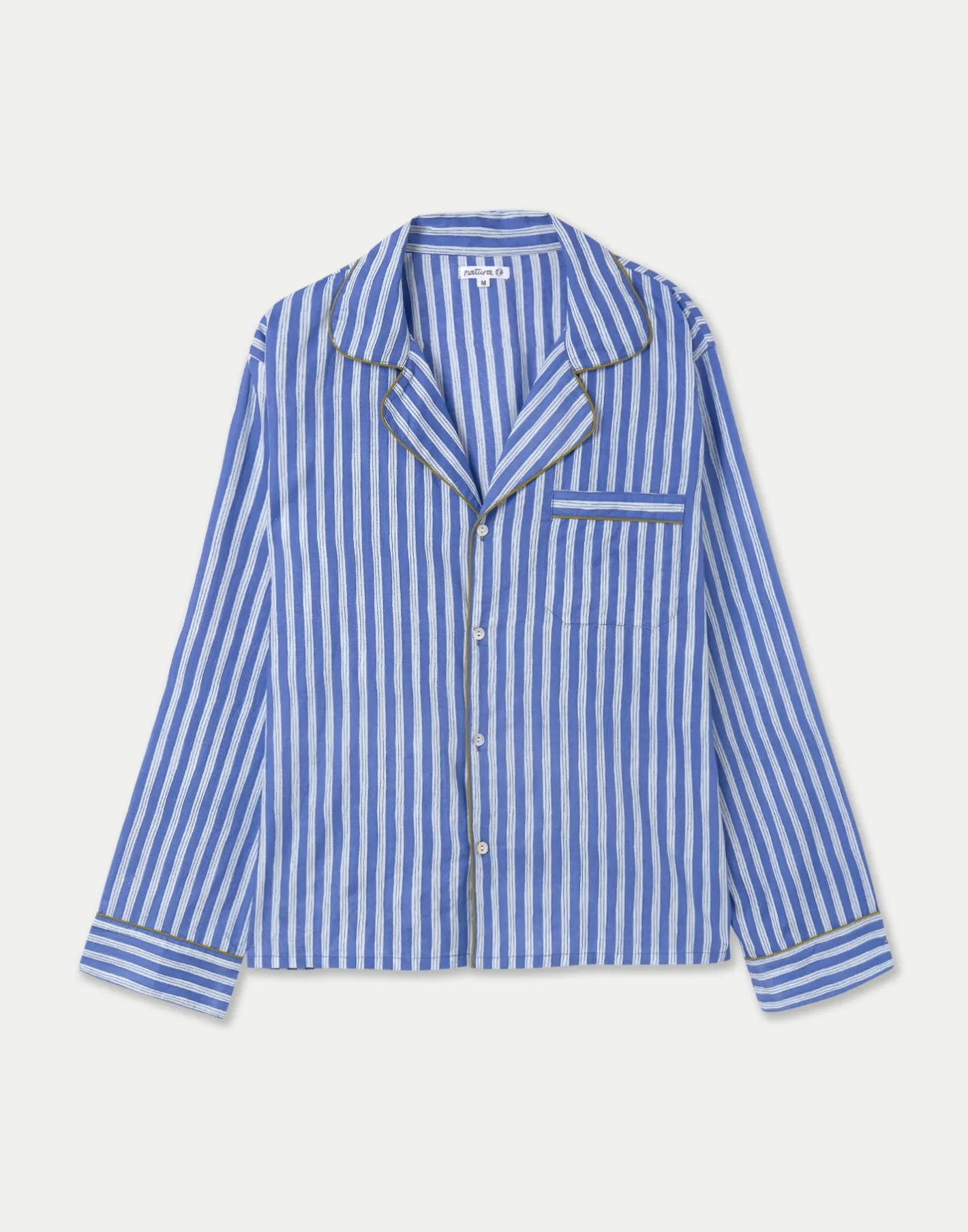 La camisa tiene cuello solapa, bolsillo de plastrón y cierre frontal de botones. El pantalón tiene cintura elástica ajustable mediante lazo y bolsillos laterales.