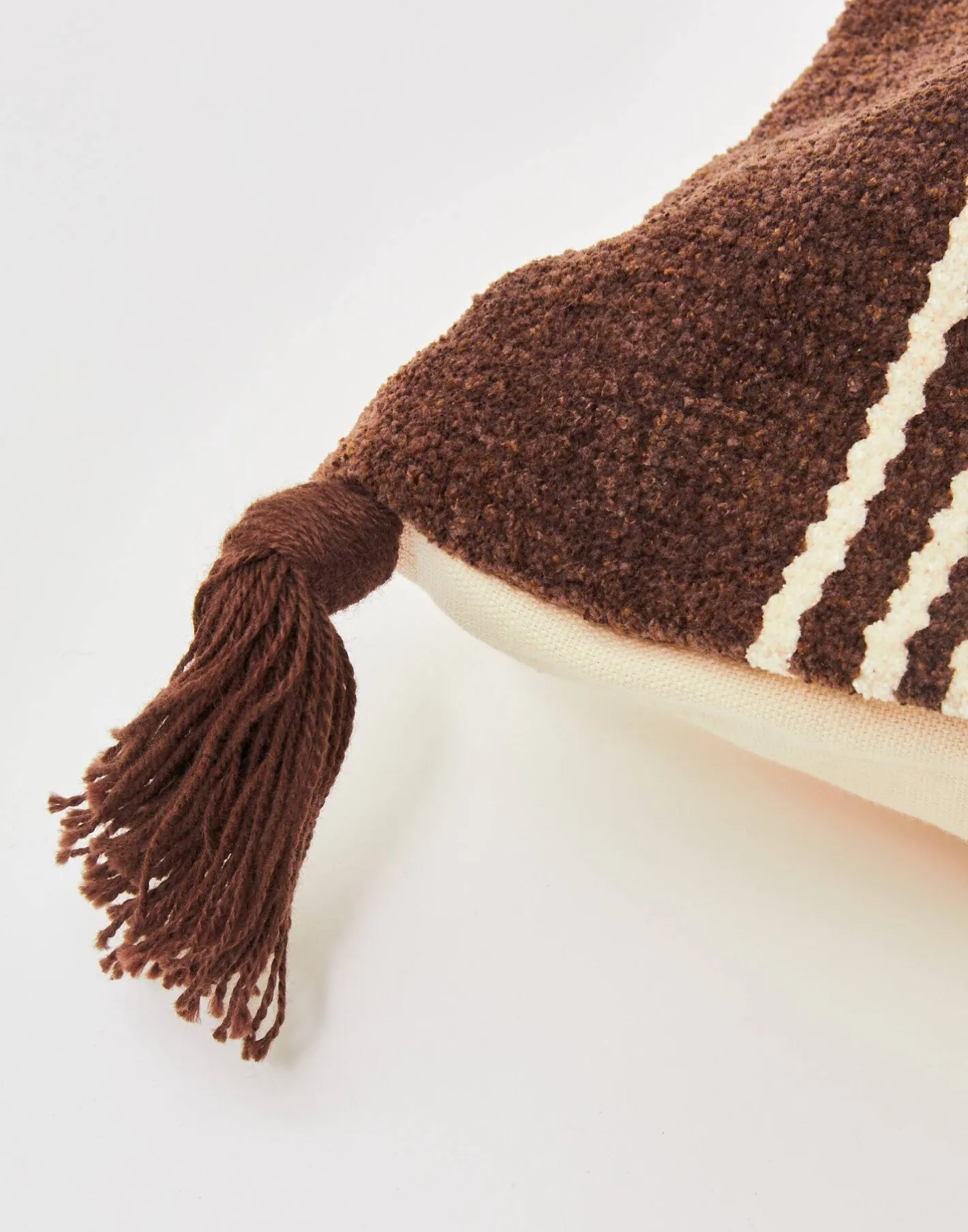 Funda de cojín con diseño de rayas en la parte frontal y pompones en las esquinas. Cierre de cremallera en la parte trasera.