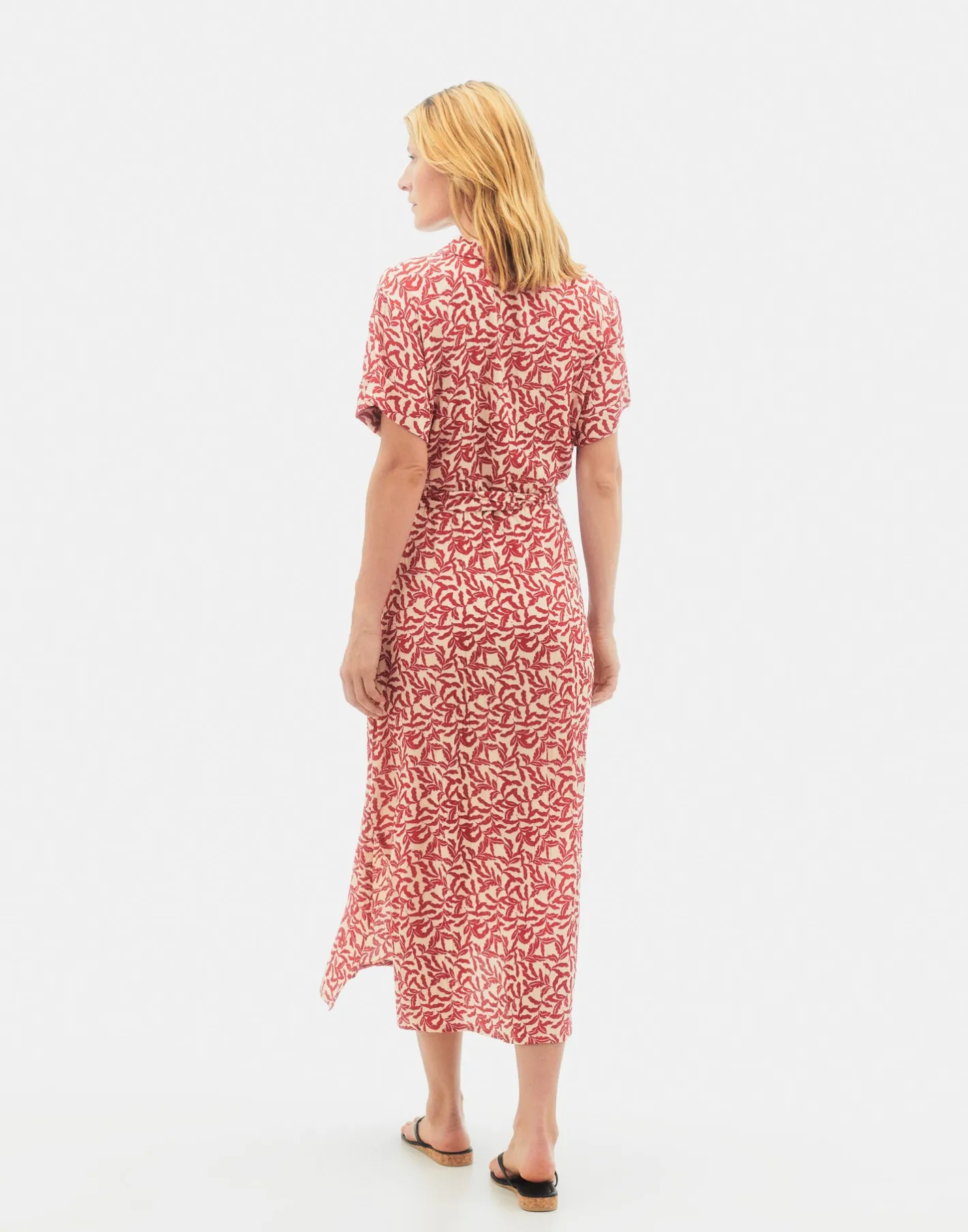 Vestido midi estampado de manga corta, con cierre frontal de botones, cinturón a tono y bolsillos laterales.