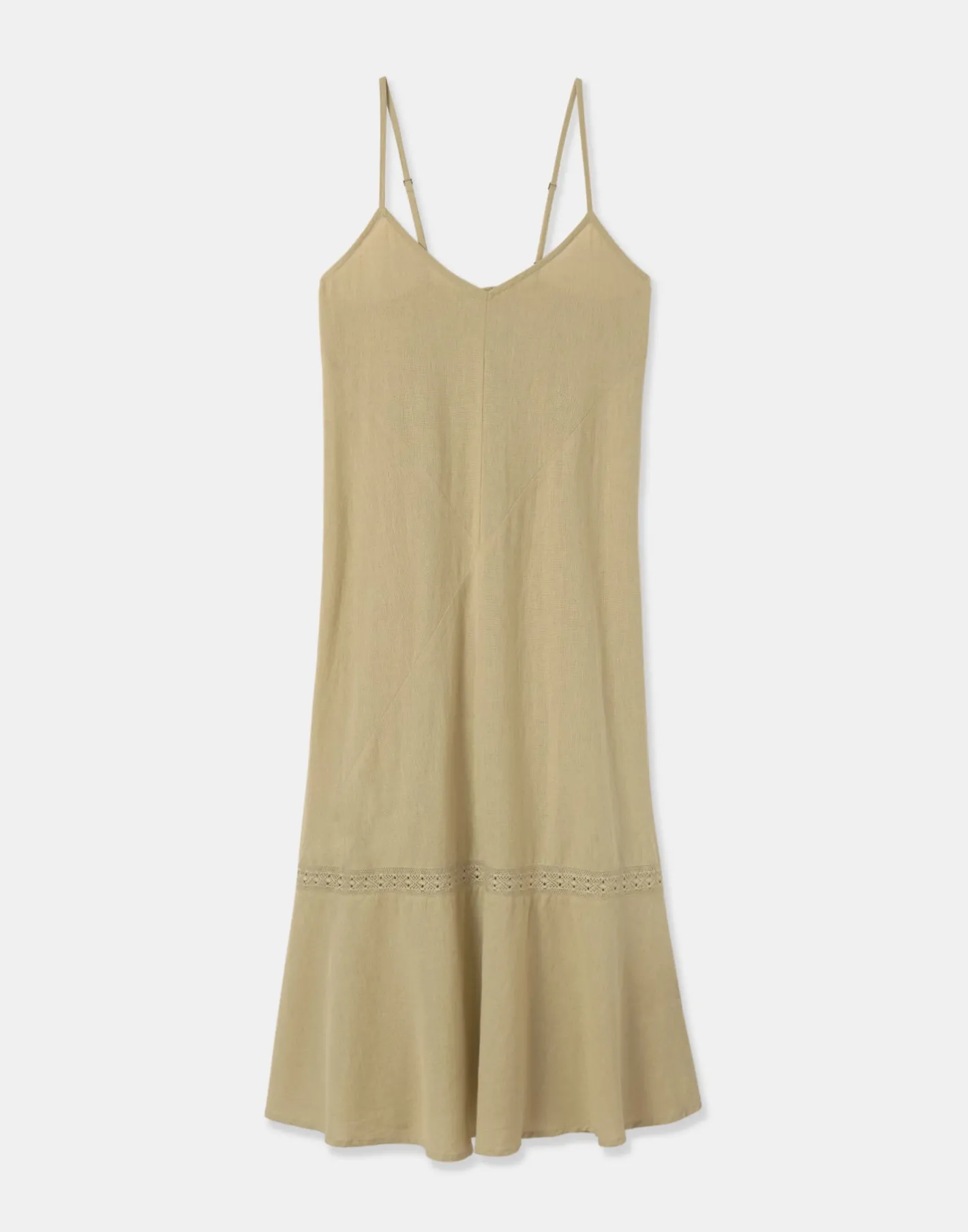 Vestido largo de tirantes, con bajo acabado en volante y detalle de cenefa con encaje.