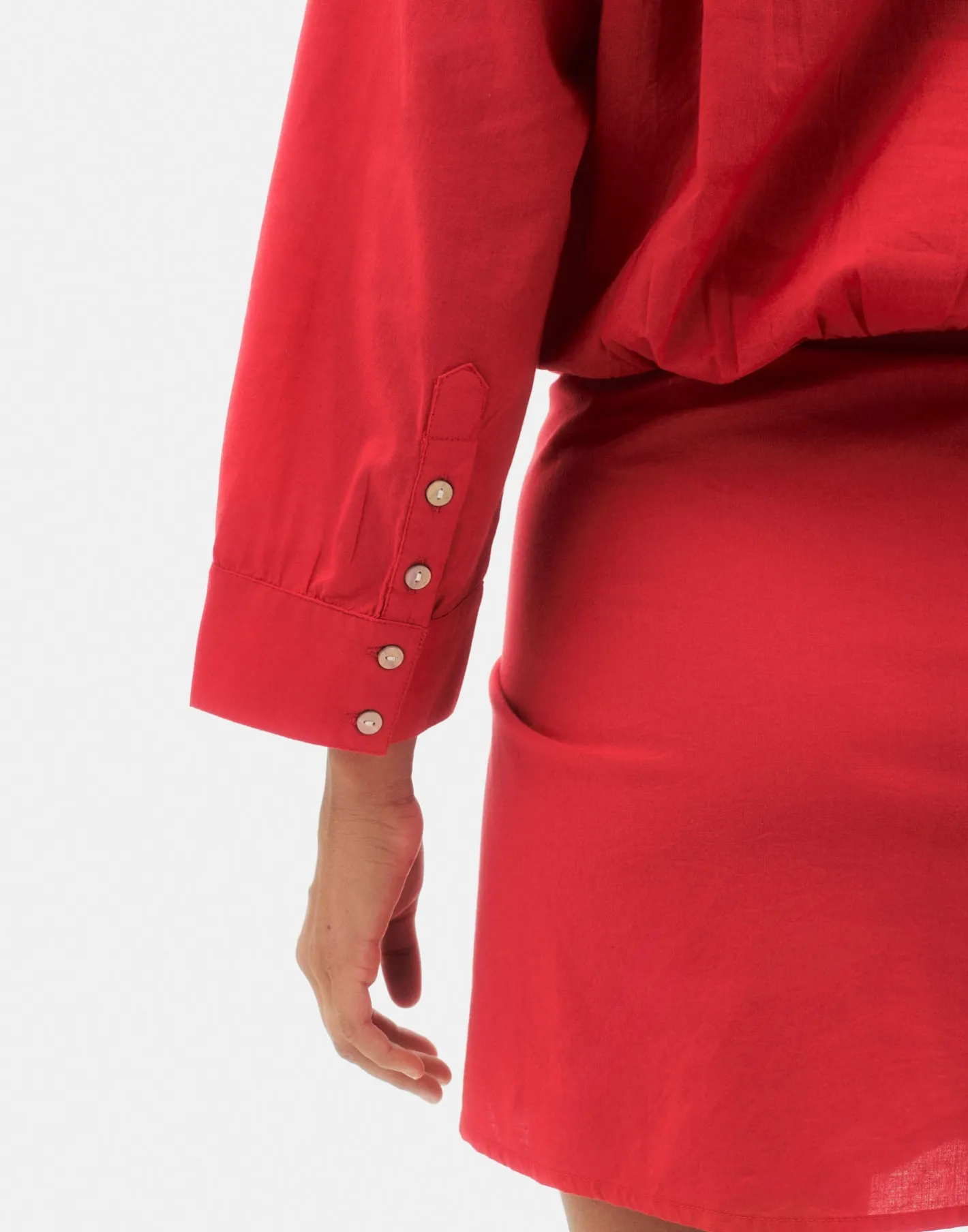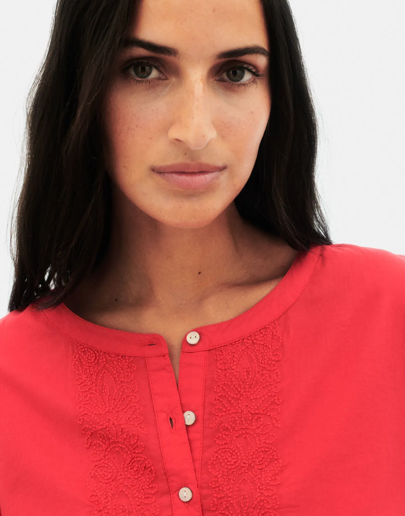 Vestido corto tipo kurta con detalles bordados, manga larga con puño abotonado y cuello redondo. Acabado con cierre de lazo en la parte frontal.