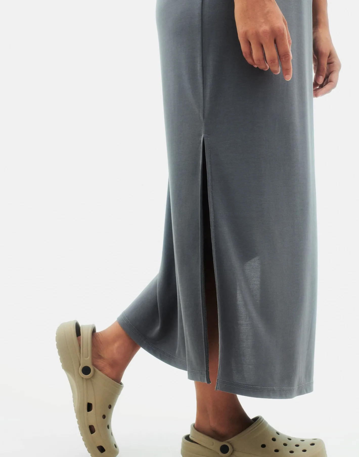 Vestido largo de manga corta y escote de pico, con aperturas laterales en el bajo.