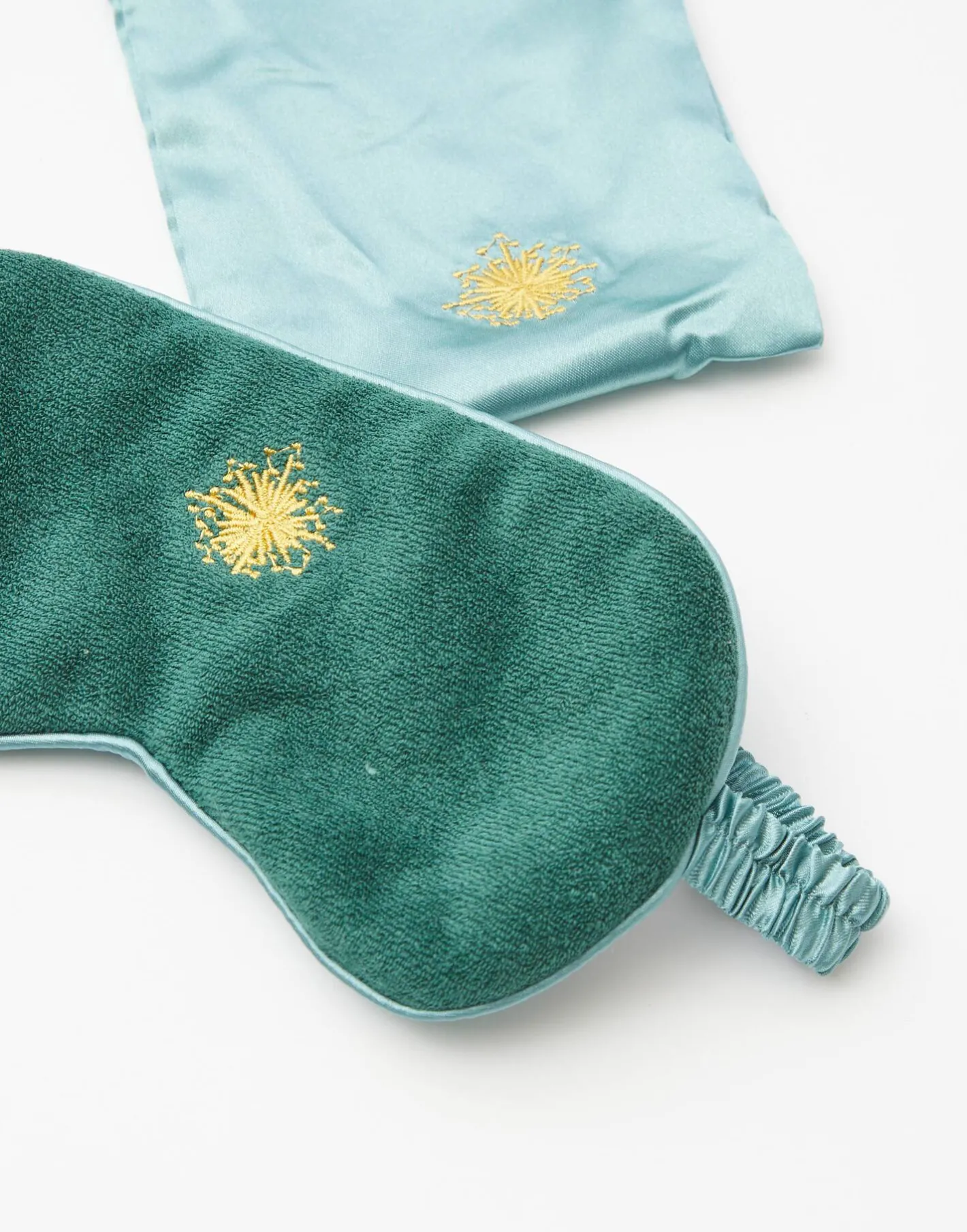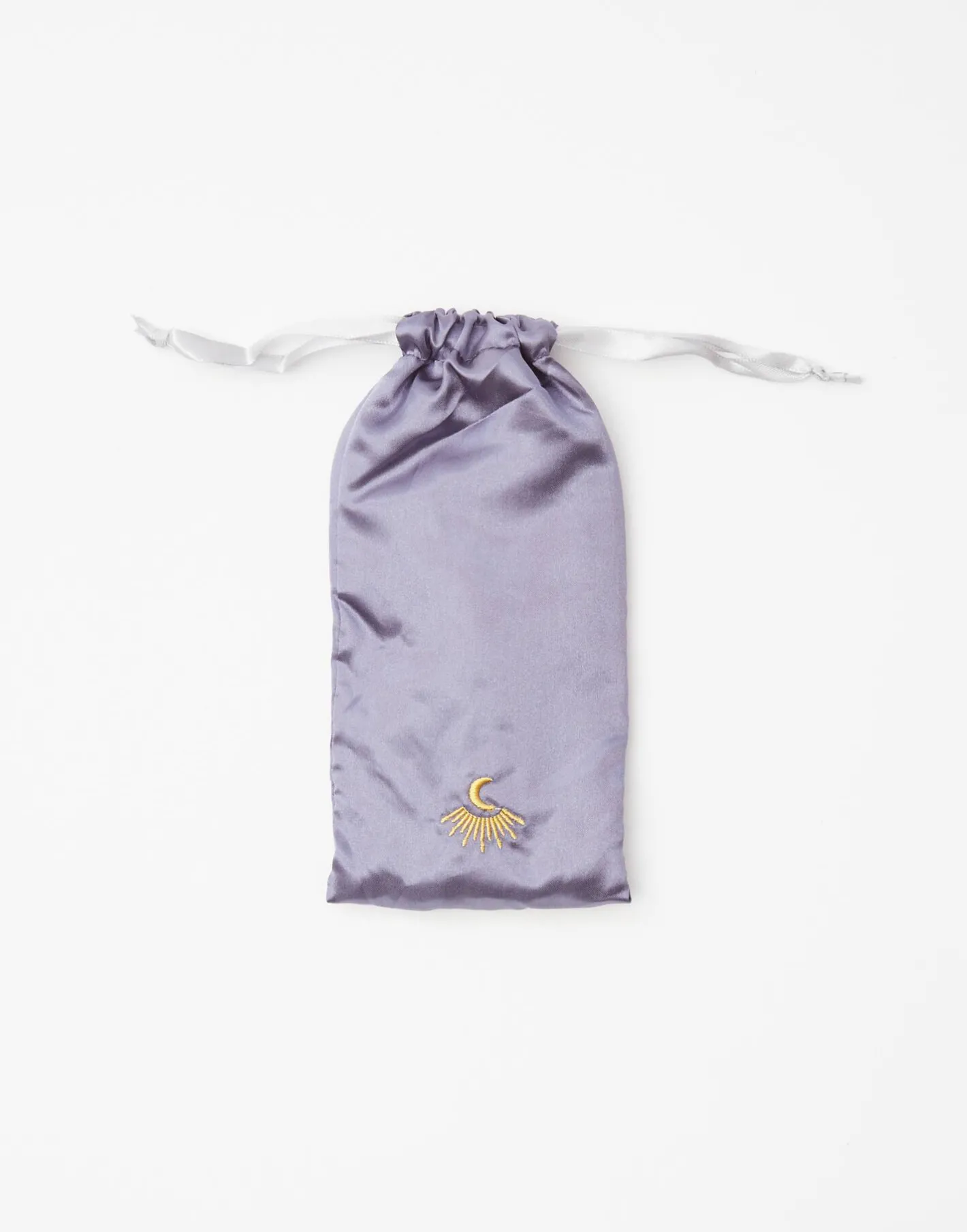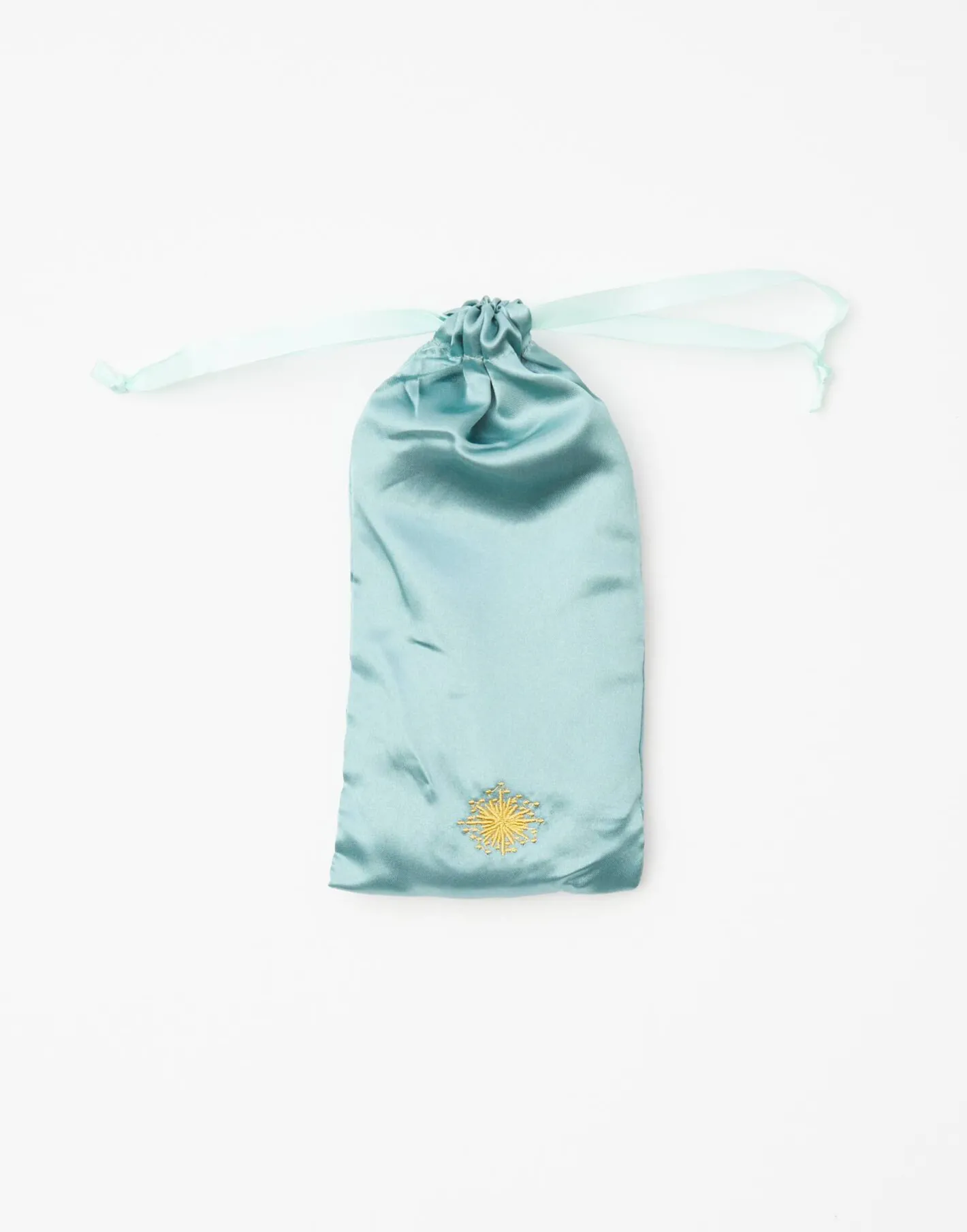 Antifaz acabado en tacto sedoso con cinta elástica. Viene en una bolsita a juego con bordado.