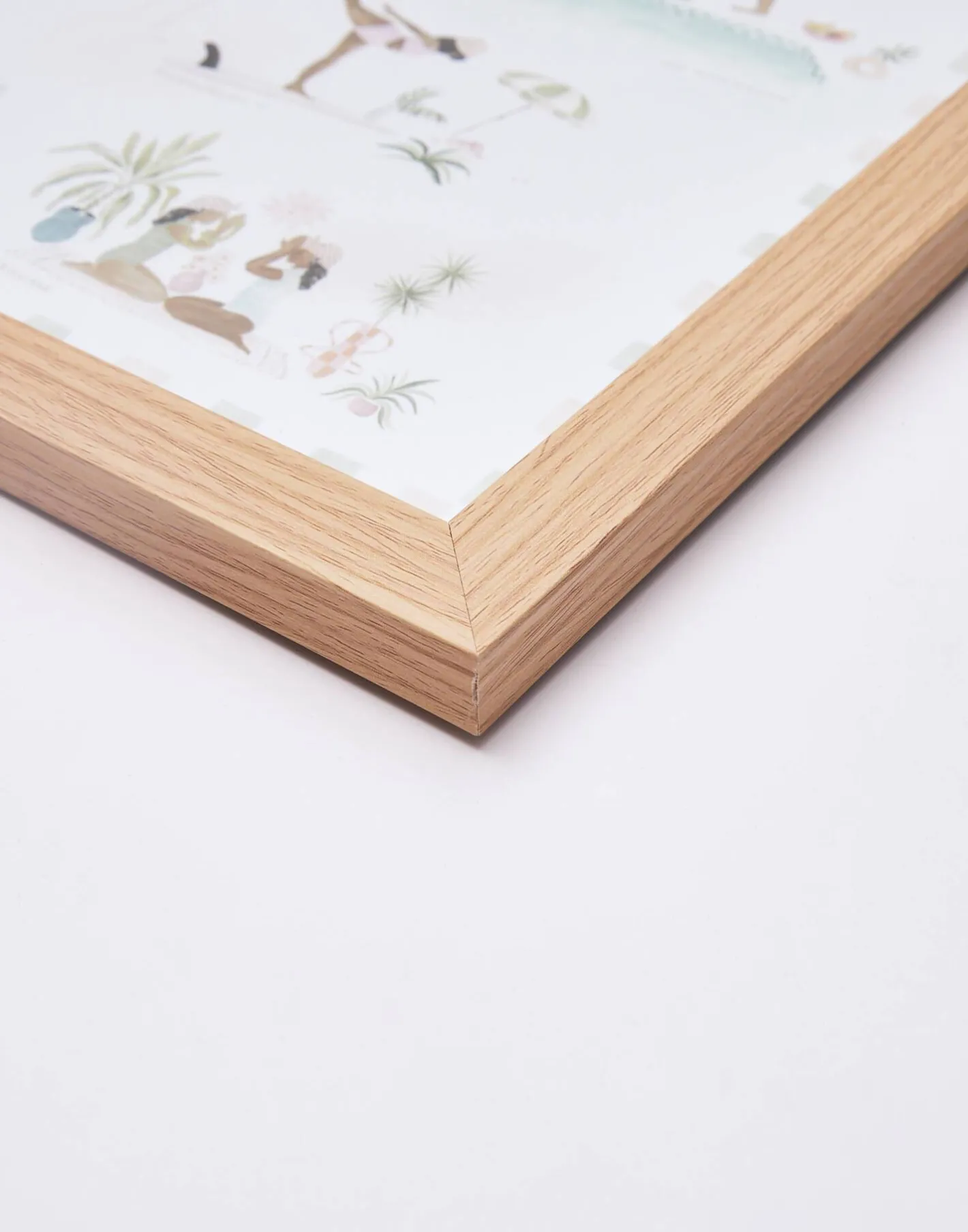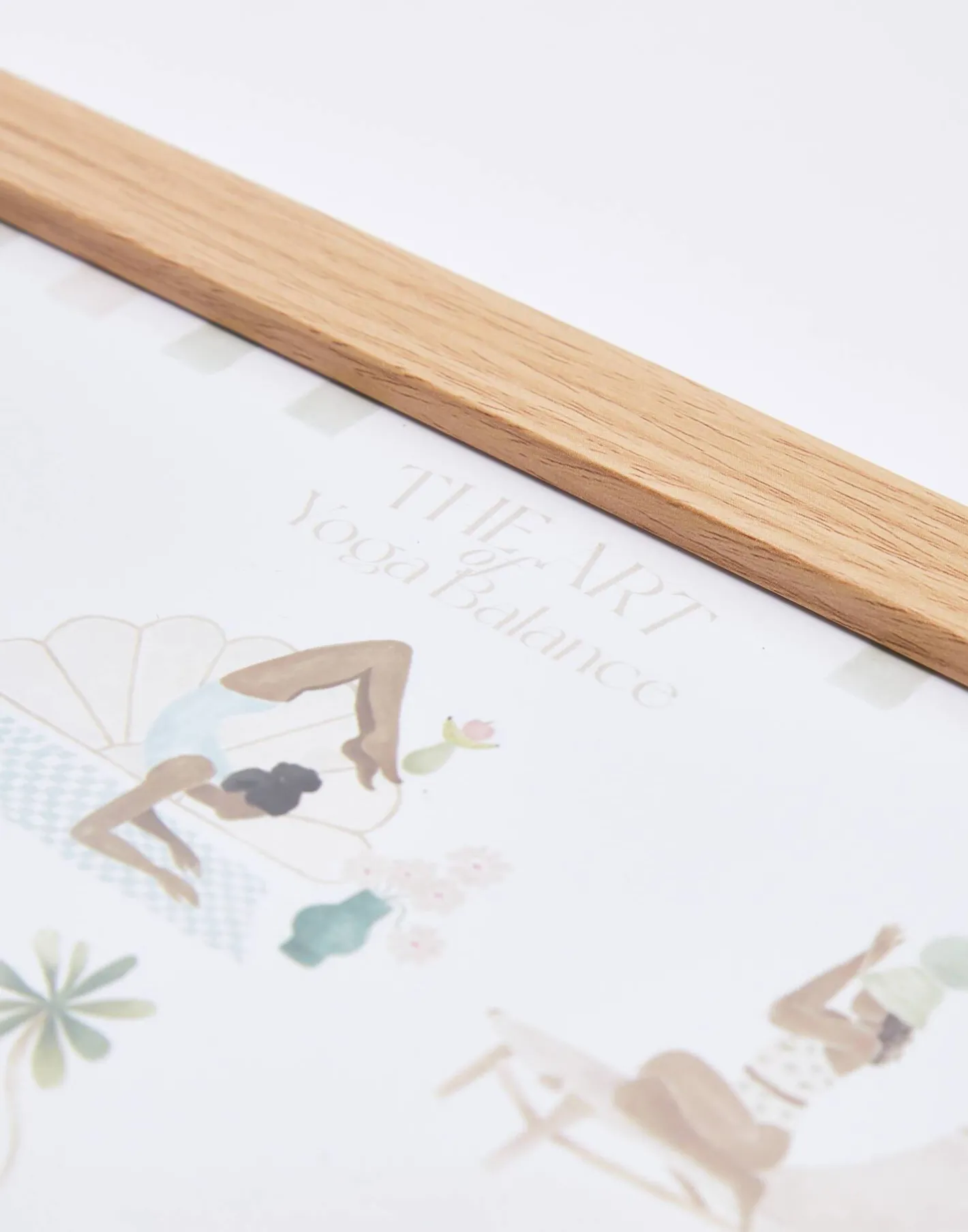 Lámina con ilustración de posturas de yoga enmarcada en madera.