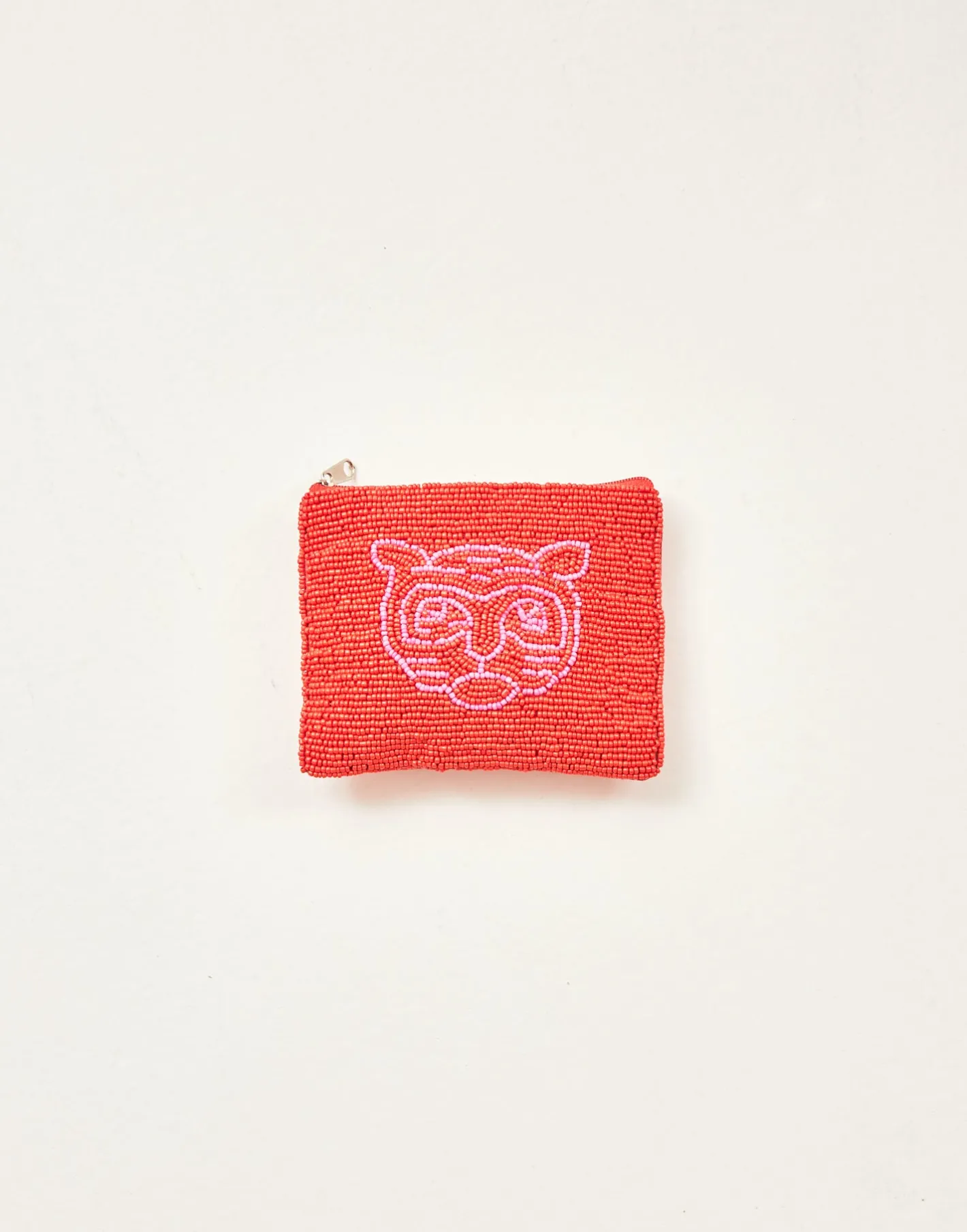 Pequeño neceser portatodo con cierre de cremallera superior. Parte frontal decorada con ilustraciones hechas con cuentas de vidrio.