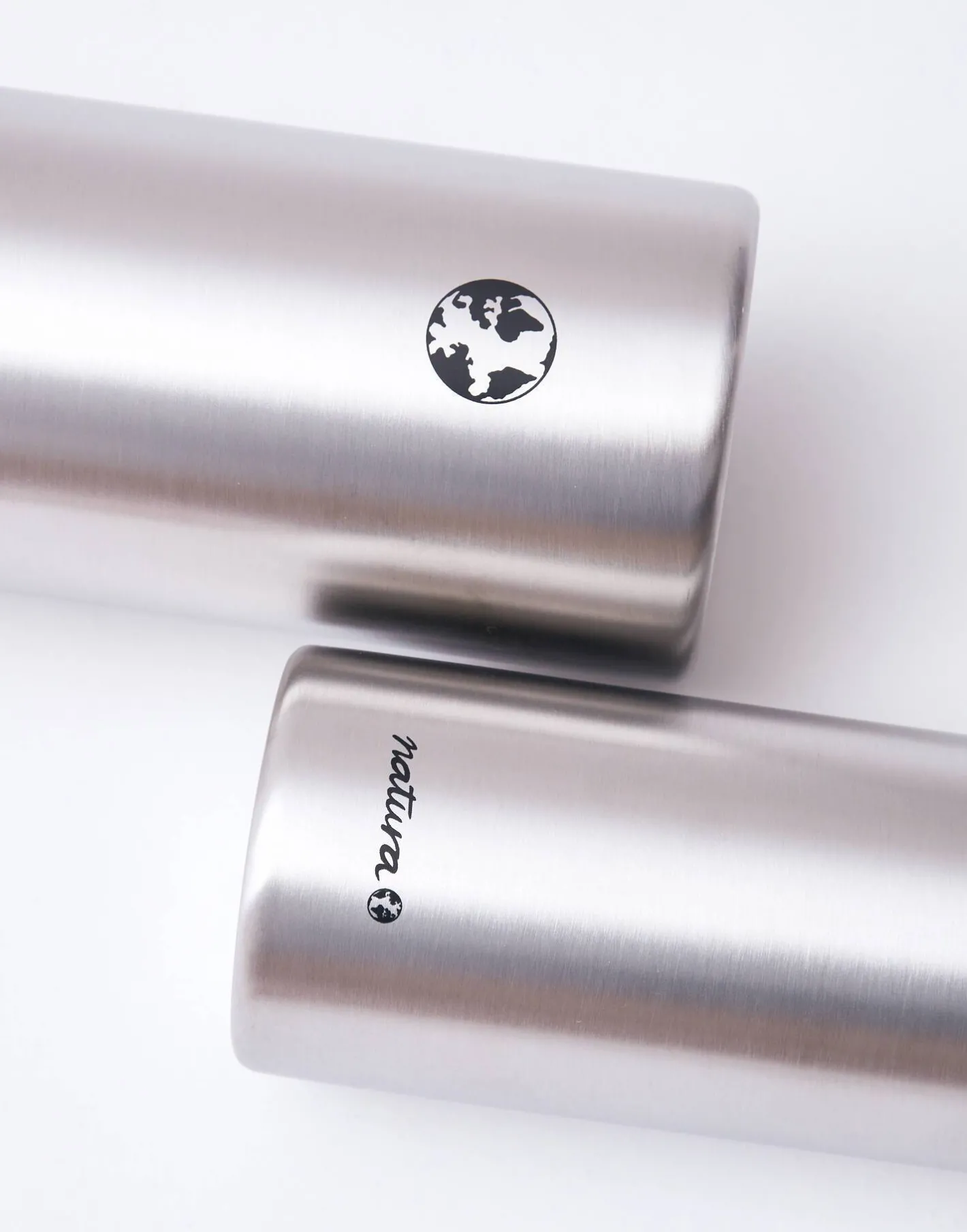 Botella reutilizable de acero inoxidable que puede utilizarse como termo. Acabada en tapón con asa.