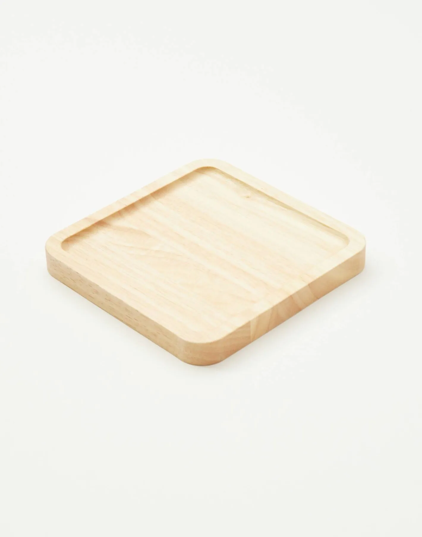 Bandeja cuadrada de madera con borde bajo y esquinas redondeadas.