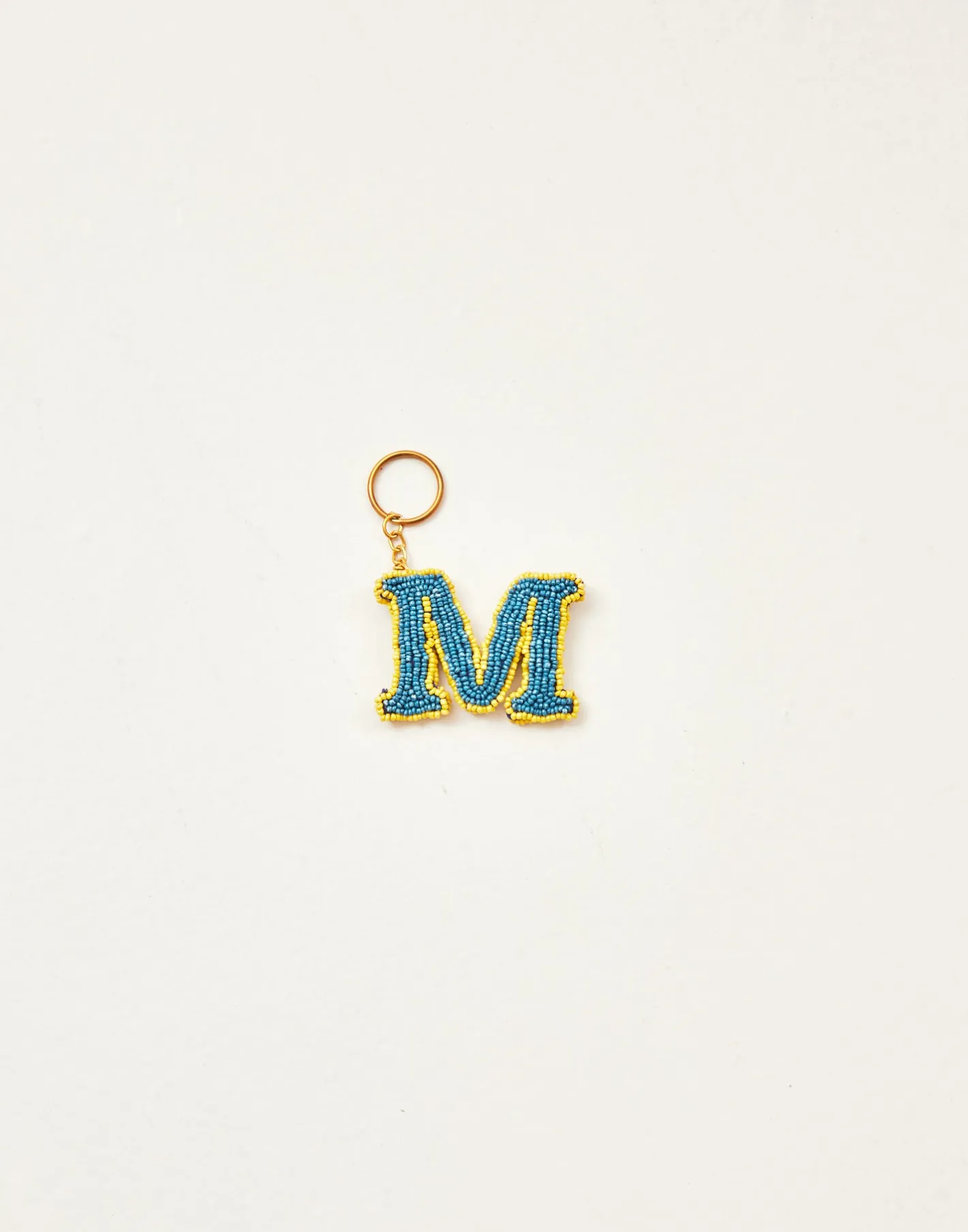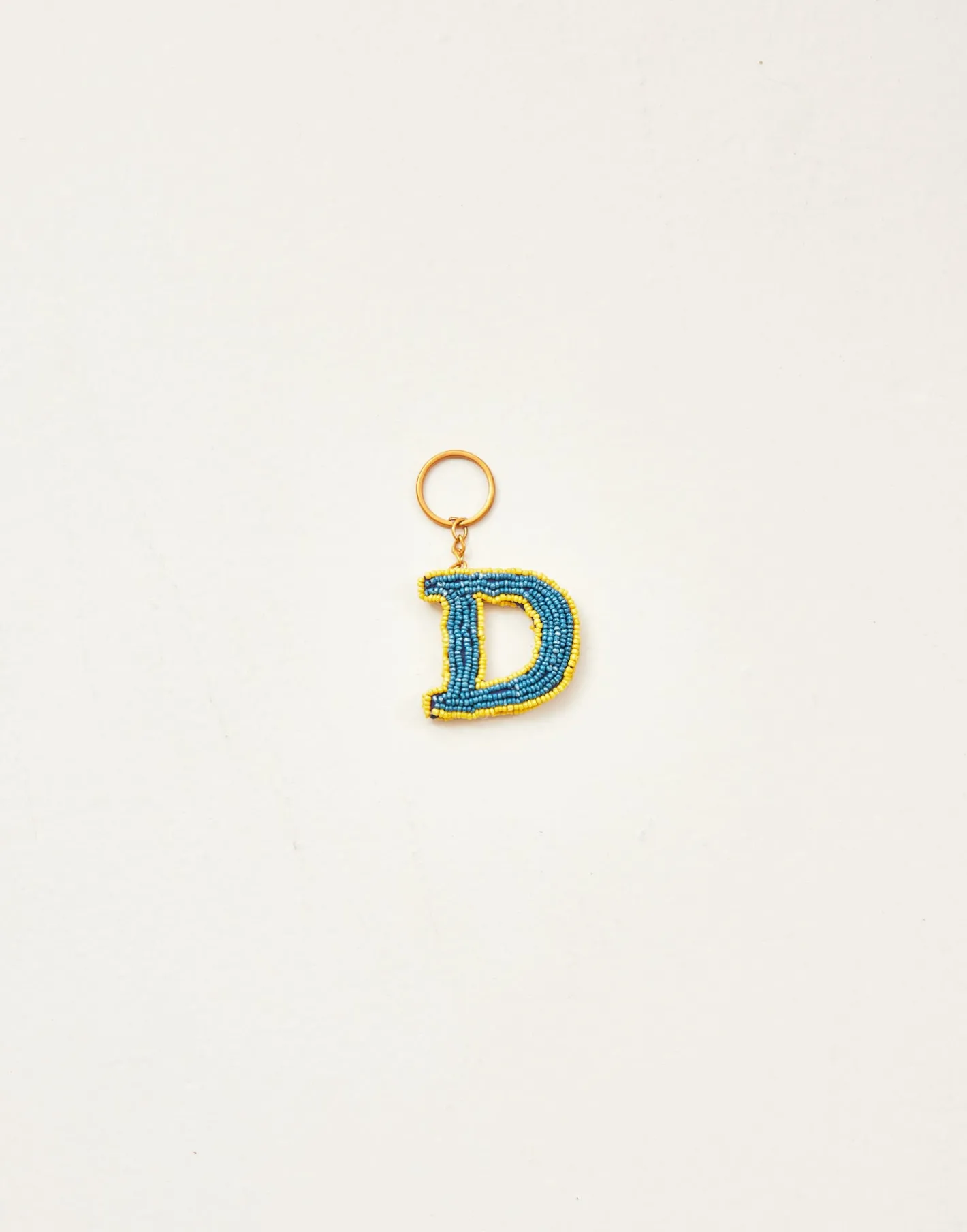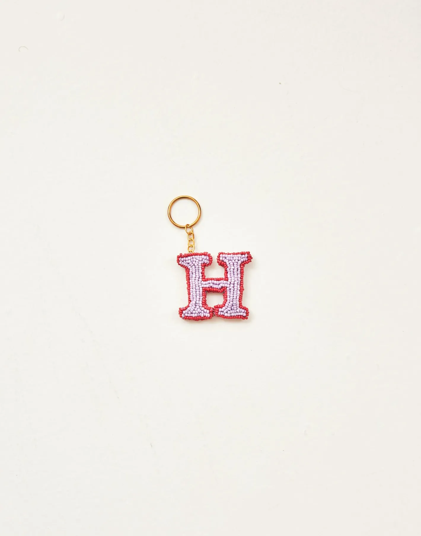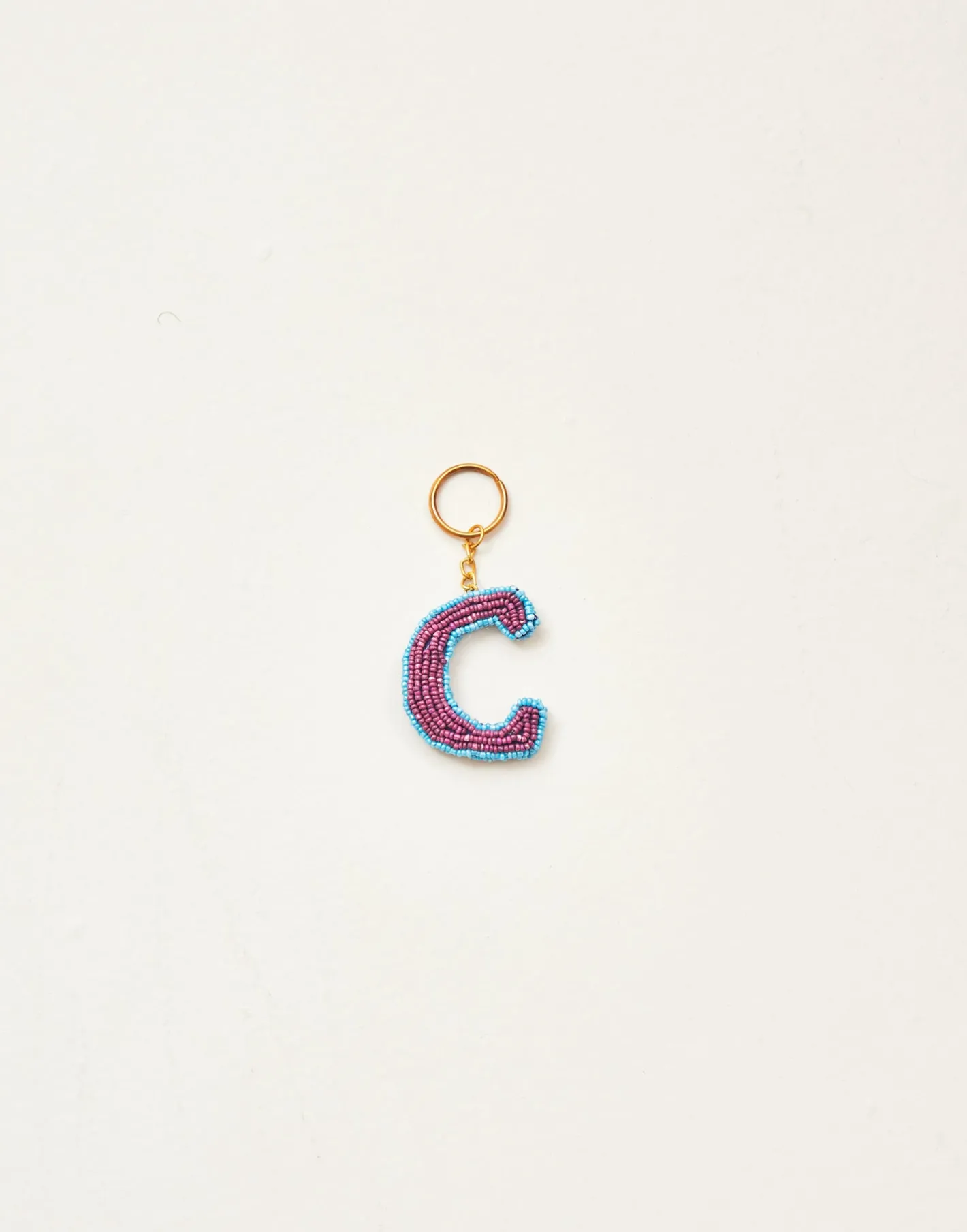 Llavero de letras hechas con cuentas de vidrio acabado con cadena y arandela.