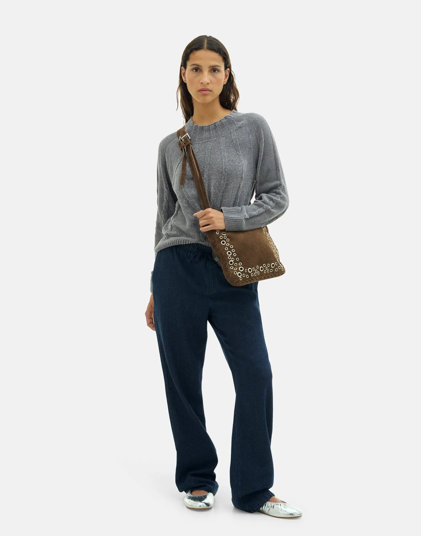 Pantalón de algodón con acabado denim. Diseño de pernera ancha, con cintura elástica ajustable mediante lazo y cuatro bolsillos.