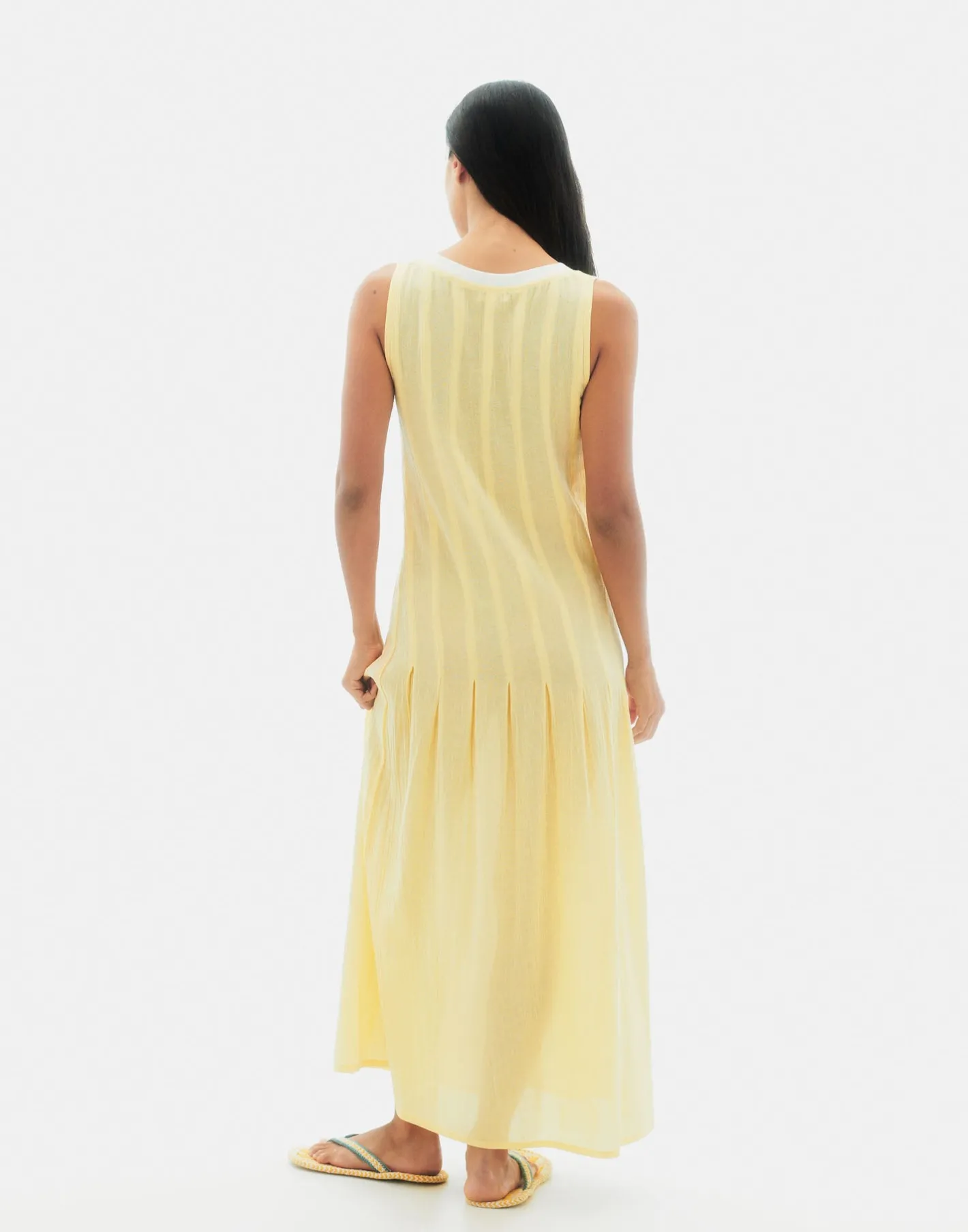Vestido largo sin mangas, con escote de pico y cierre parcial de botones. Acabado con detalles plisados.