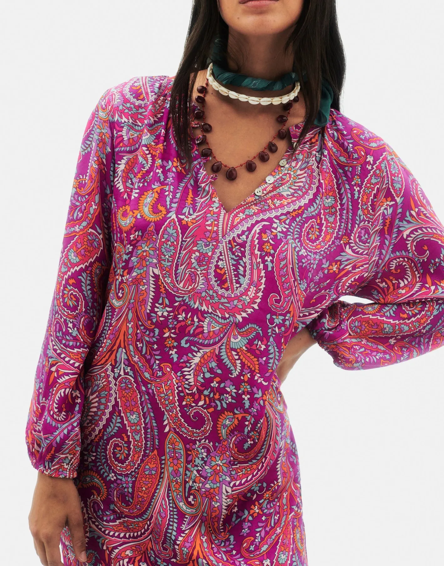 Vestido en mezcla de seda con estampado paisley, escote de pico con cierre de botones y manga larga.