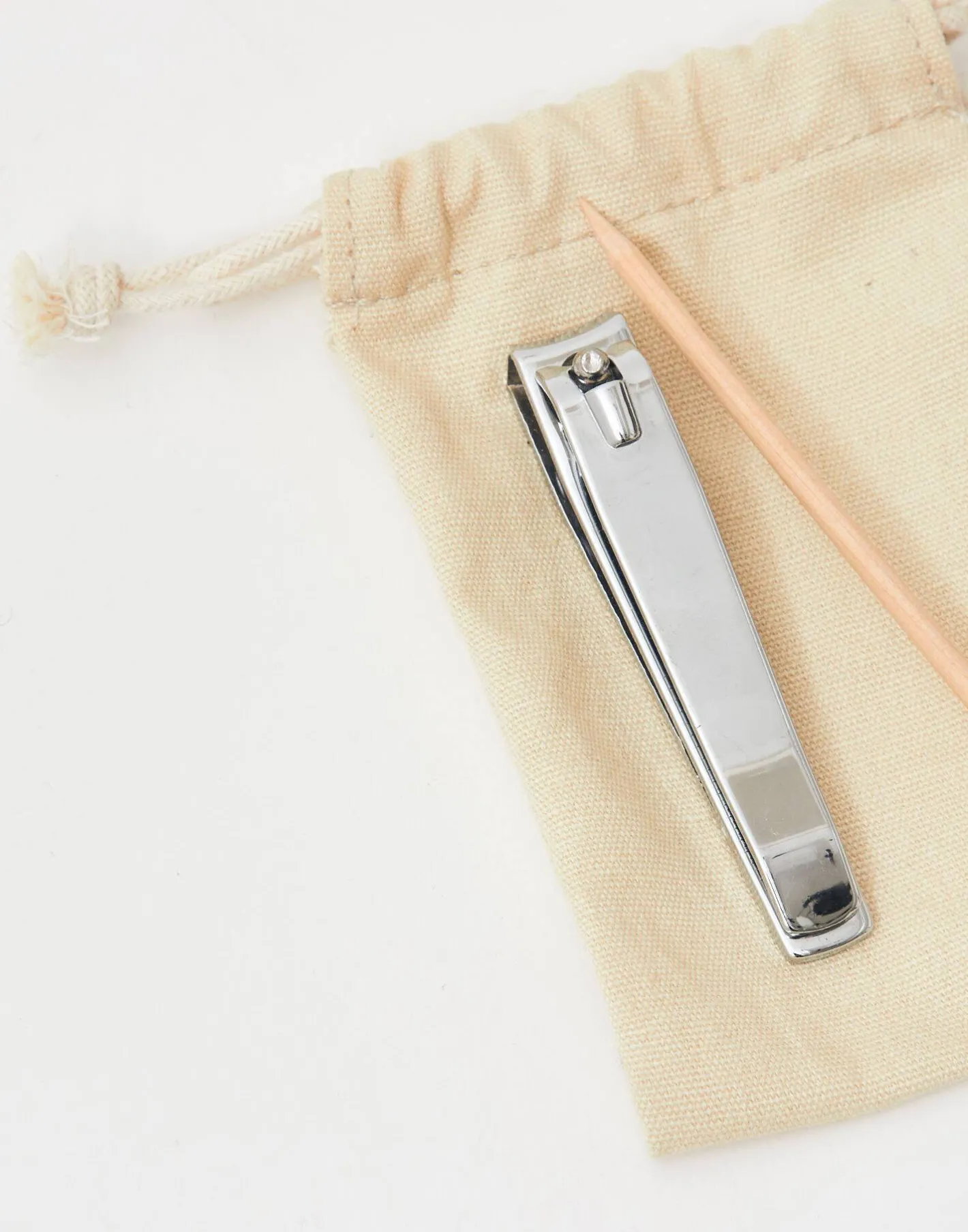 Cuida tus manos en cualquier lugar con este sencillo kit de manicura para viaje. Contiene cortauñas de acero inoxidable, cortacutículas de acero inoxidable, lima de cristal, limpiacutículas de madera y una bolsa de algodón.